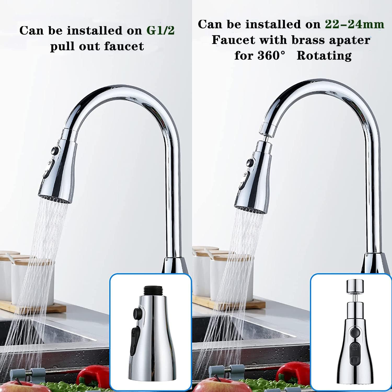 【Easy To Install】:1-Remove your original tap aerator with wrench or by your hand & install our tap spray head. 2-Two installation solutions for the kitchen tap, if the kitchen tap is a universal round tap of 22mm Male thread or 24mm Female thread faucets, please use the 360° swivel connector. If the tap is G1/2 faucet aerator like pulling-hose tap, don't need to use 360°swivel connector. 3-Please remove the aerator and clean it if there is blockage of the tap.