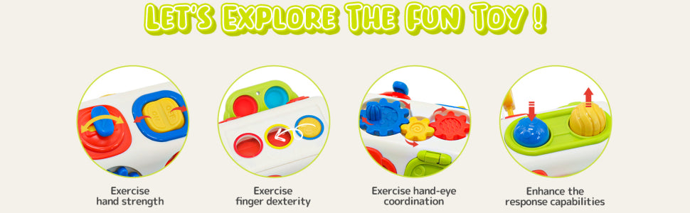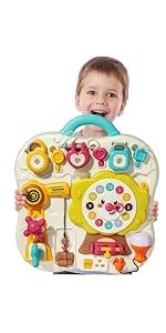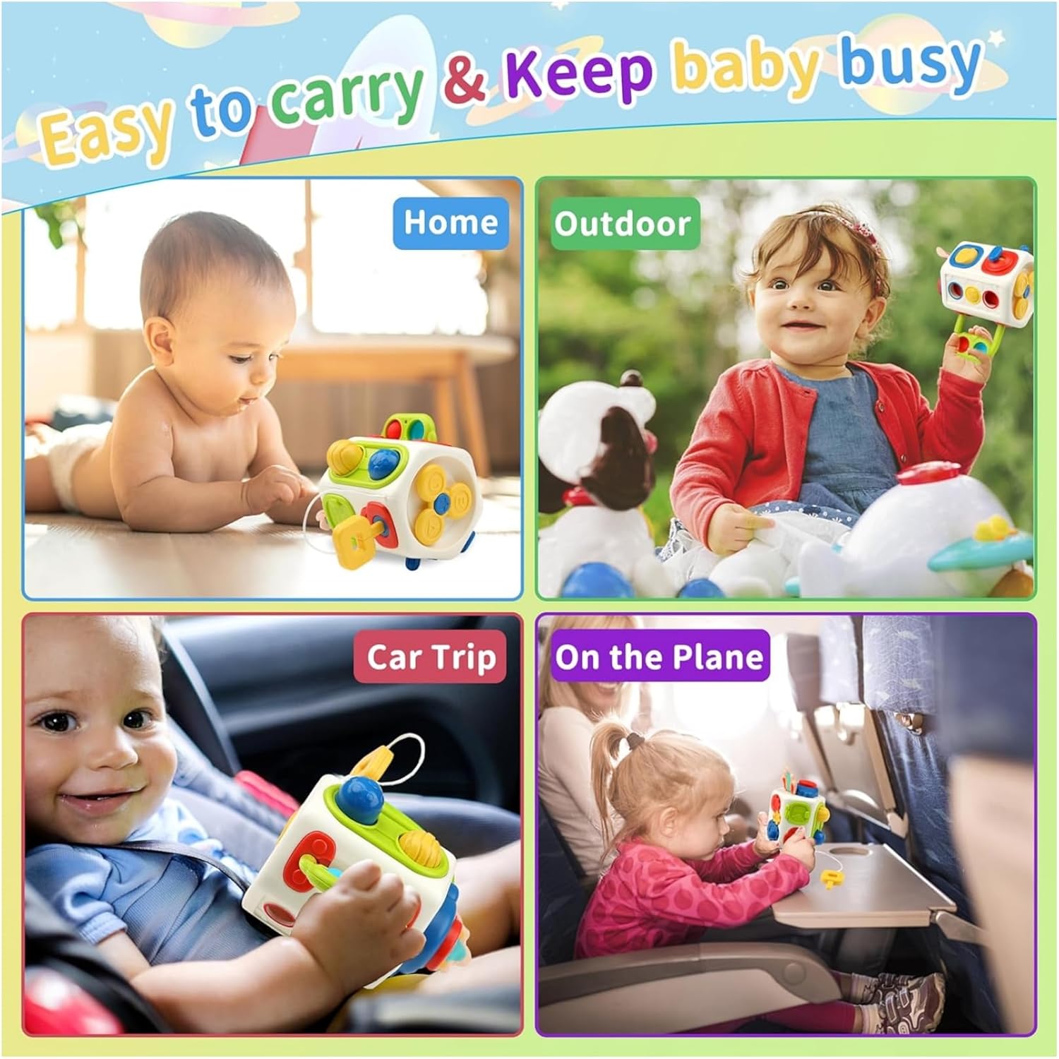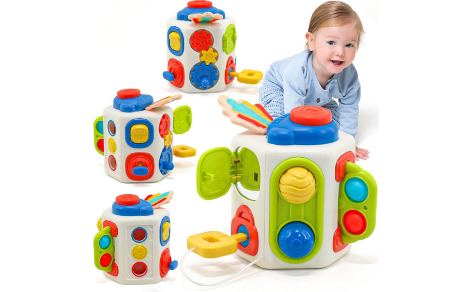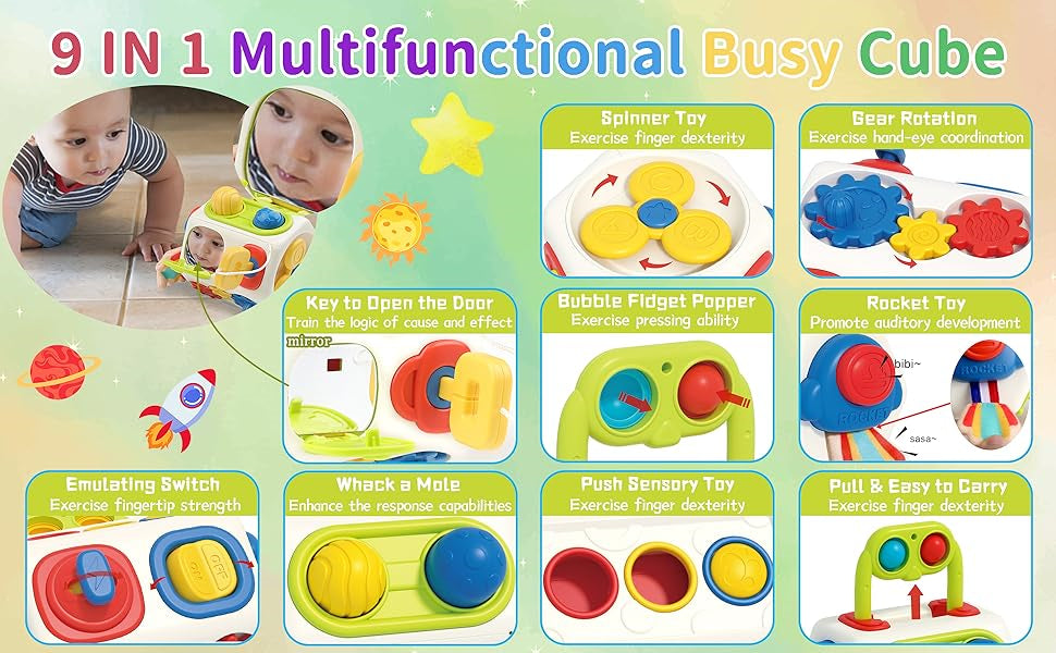 • 🚀【9 IN 1 Multifunctional Busy Cube】Are you worry about your little one being noisy or pestering you when you're busy? Look at here! The toddler toys busy cube contains 9 activities offer different experiences: Rocket Toy(bi bi~) & Whistle(sa sa~), Key to open the door, Emulating Power Switch, Pull & Easy to Carry, Gear Rotation, Whack a Mole, Push Sensory Toys... The baby toys keep kids busy and entertained for hours, also bring hours of peace to parents.
