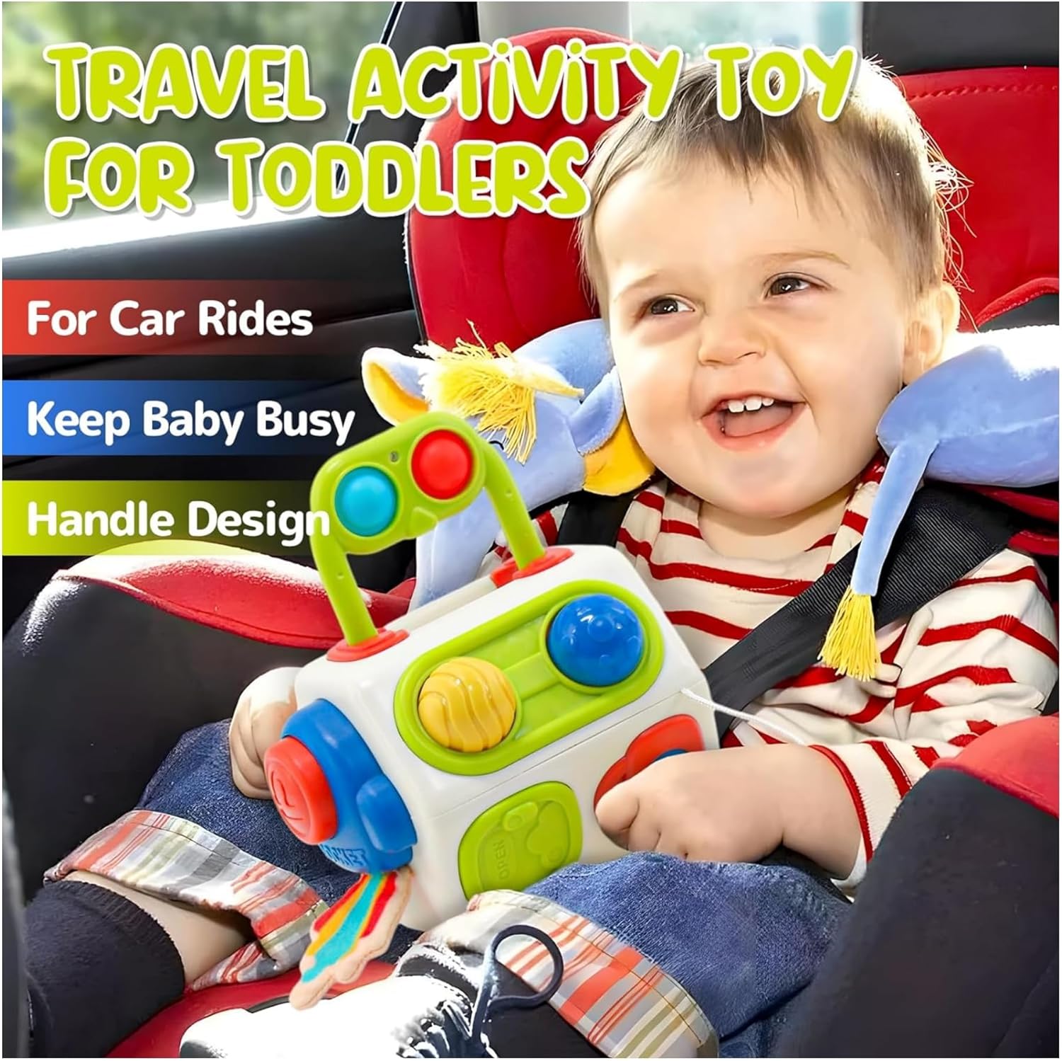 • ✈【Perfect Size Travel Toys】Are you worry your kids being noisy or cry on the trip? If yes, just get this toddler travel toy to make your baby quiet down. No matter when you're busy for housework or work at home, eating at restaurant, trip on the car or plane. (bi bi~)Each press the Rocket Toy button, touch crinkly will trigger funny sounds to attract baby's attention. The small size(4.3x3.7x5.3in) busy cube is perfect for toddlers to grip and carry.