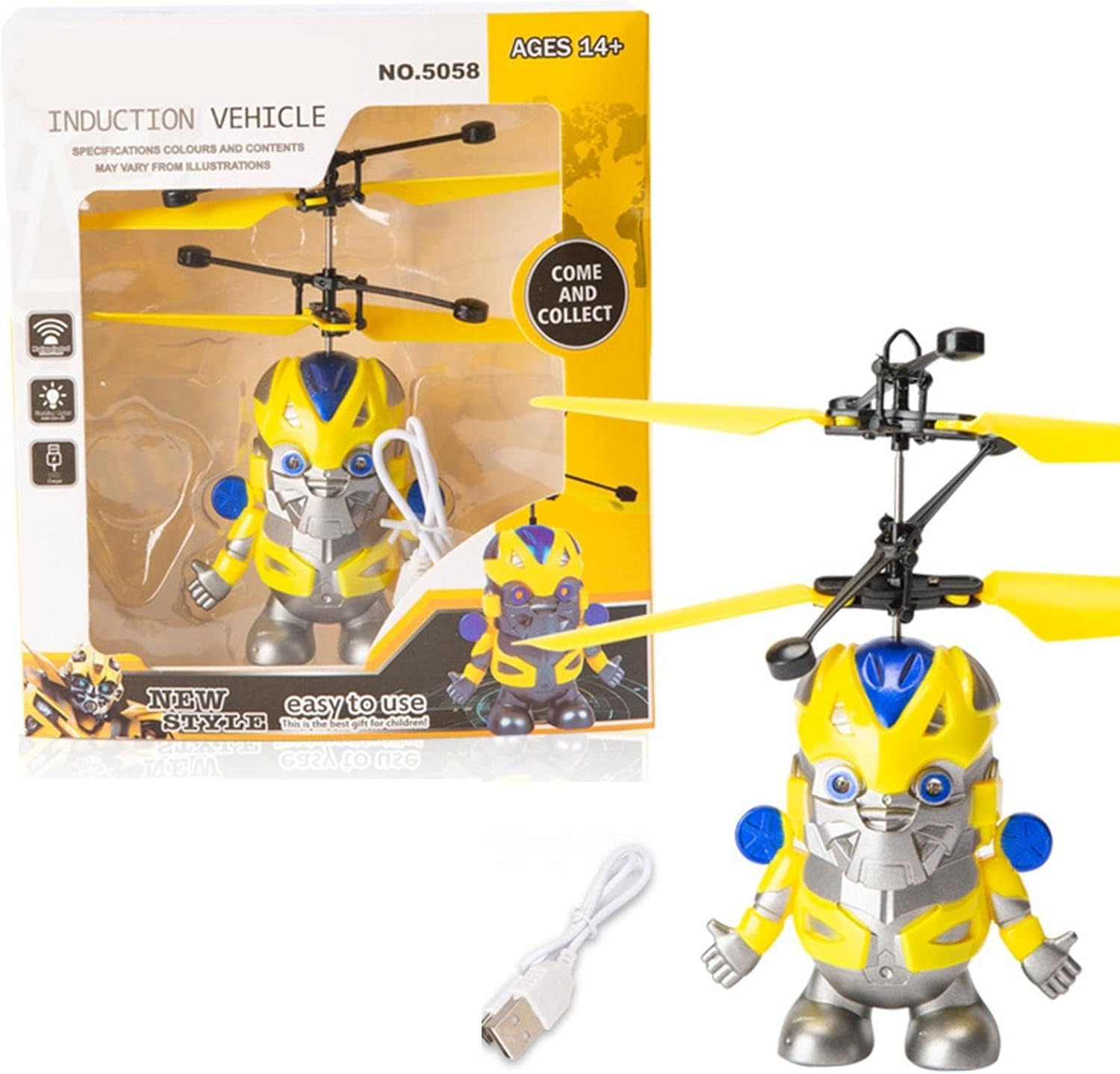 Description: The flying helicopter robot is easy for children to control and has flashing LED lights. When switched on, the light flashes brightly, which is visually very appealing. Features: 1. Easy to control: you can use the remote control or gestures to control the flying toy for interactive games. 2. Induction technology: the robot sensor aircraft is equipped with luminous LED light infrared sensor technology. 3. DURABLE & STURDY - The robot induction aircraft is made of ABS material, which is safe and durable. Specifications: Features: Take off in 3 seconds. With light. Product size: approx. 14.5 x 13.5 cm / 5.7 x 5.3 inches. Weight: approx. 0.68 kg. Box contents: 1 x USB cable. 1 x robot.
