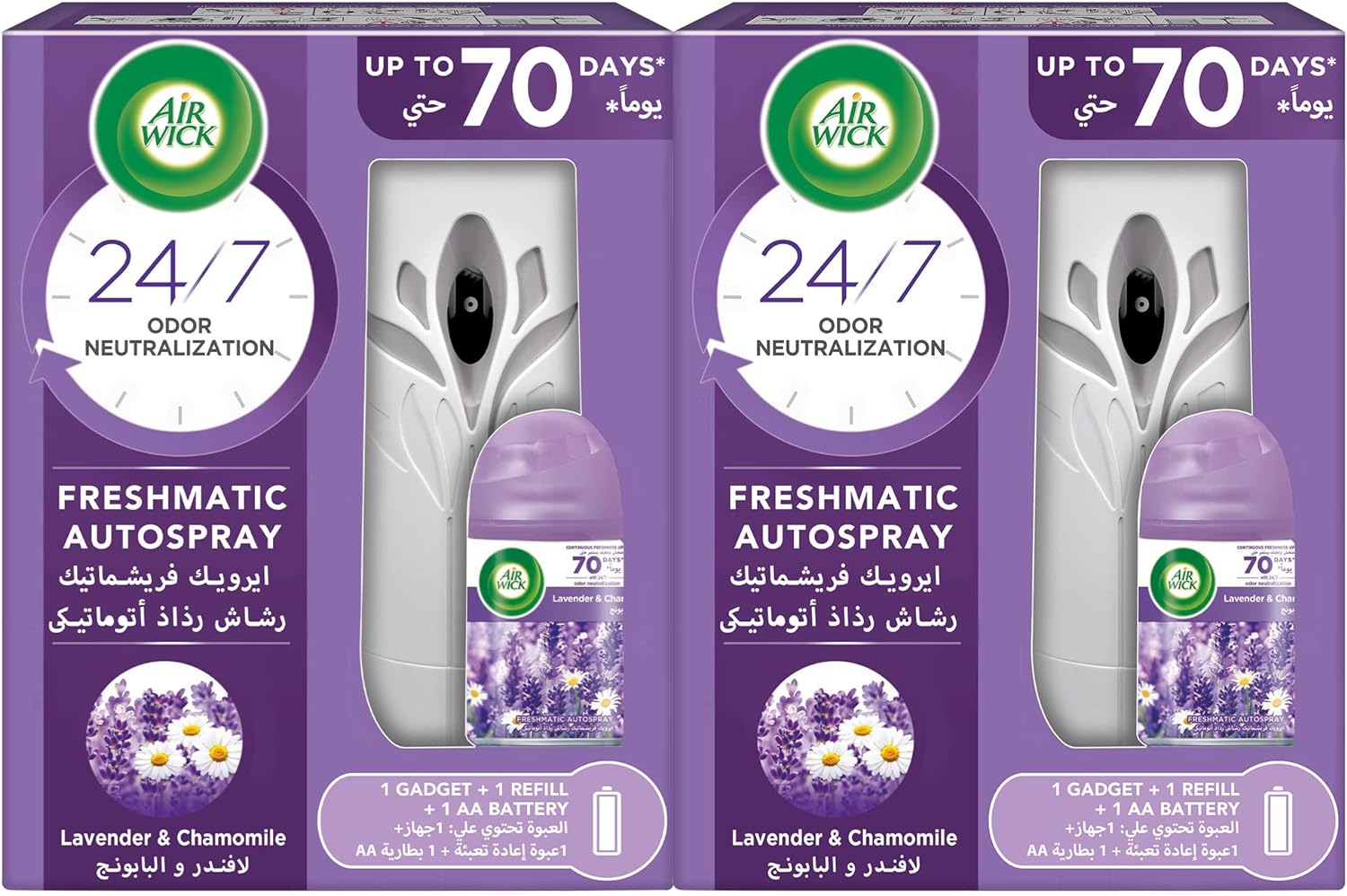 PACK CONTENT: This pack contains 2 Air Wick Freshmatic Autospray gadget, 2 refills and 2 AA batteries
