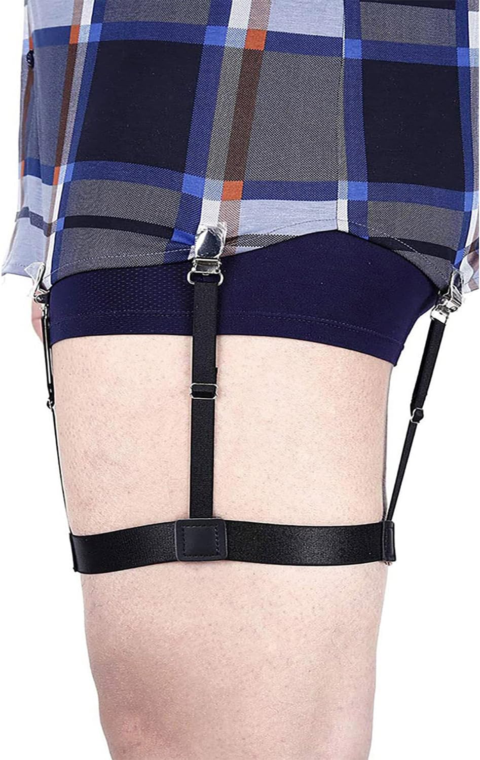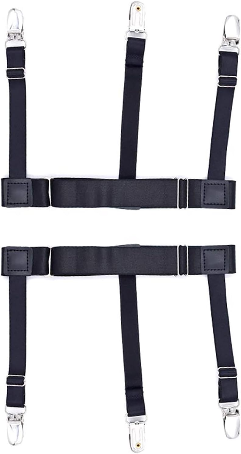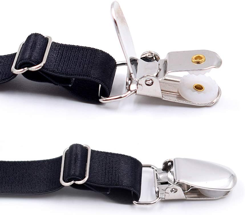 Our shirt stays are tough enough for use with army or military uniforms or for law enforcement officers, while maintaining a sleek and sophisticated designer-grade style that is appropriate for wedding suits as well. Add one to your cart today!Quick and easy to adjust. These shirt stays almost any height person.Please note: We had upgrade the shirt stays' clips. The clips are made of high quality metal with rounded plastic teeth insert to ensure maximum hold on thick fabric and prevent damage on fabric. Non-slip clips keep your shirt smoothly tucked in all day long.Unique accessory design is the perfect way to always keep your shirt tucked in and ensure the straps won’t break or snap while still maintaining ultimate elasticity. Sit, stand, move and groove, and your shirt will stay tucked all day.