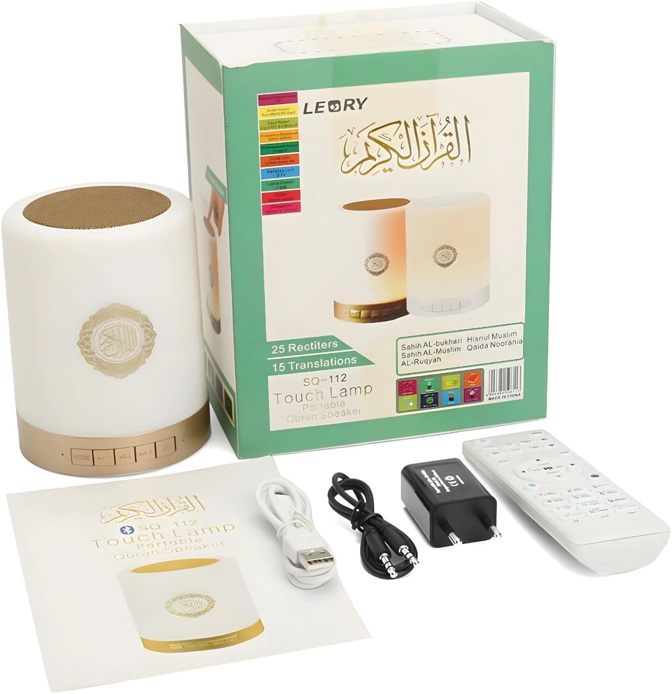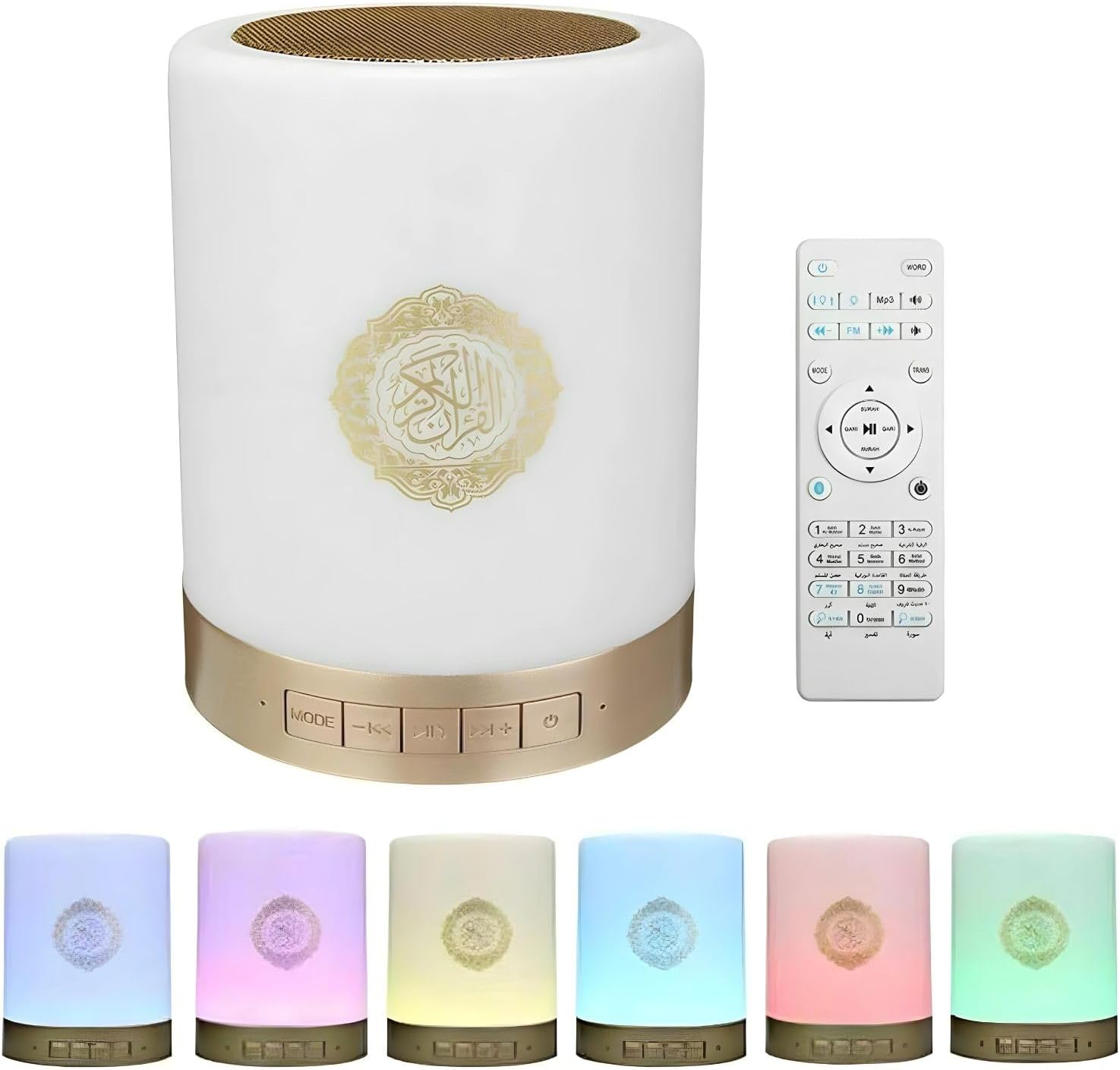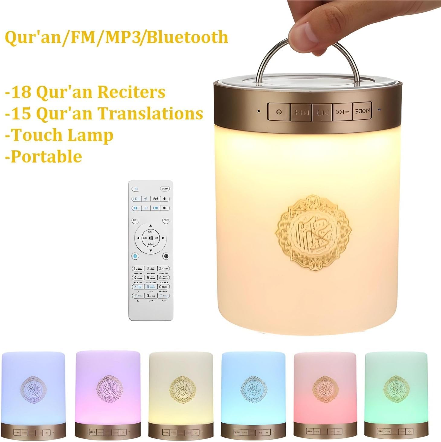 Smart Touch LED Lamp with Quran Bluetooth Speaker, Remote Control, Rechargeable, Featuring Full by 25 Reciters with 15 Languages Translations