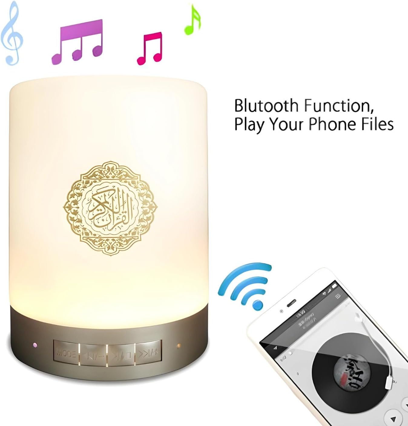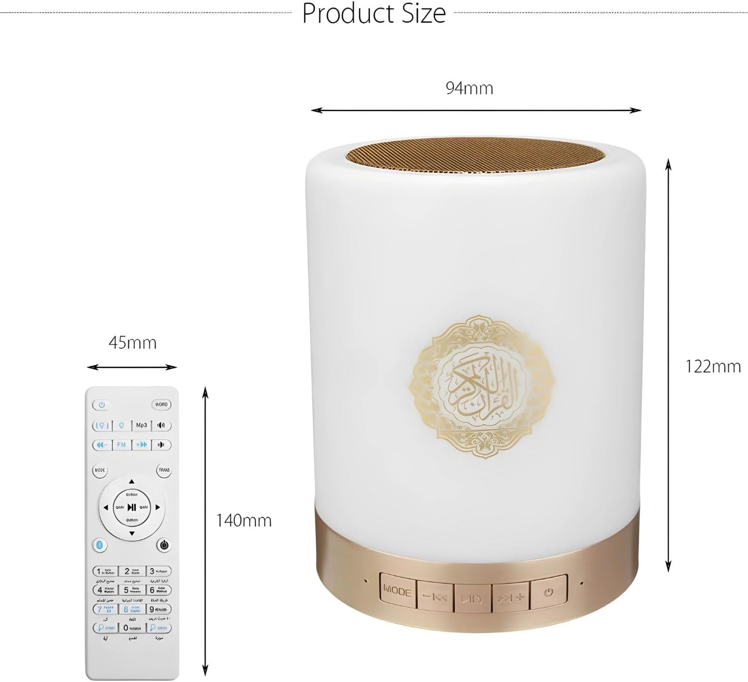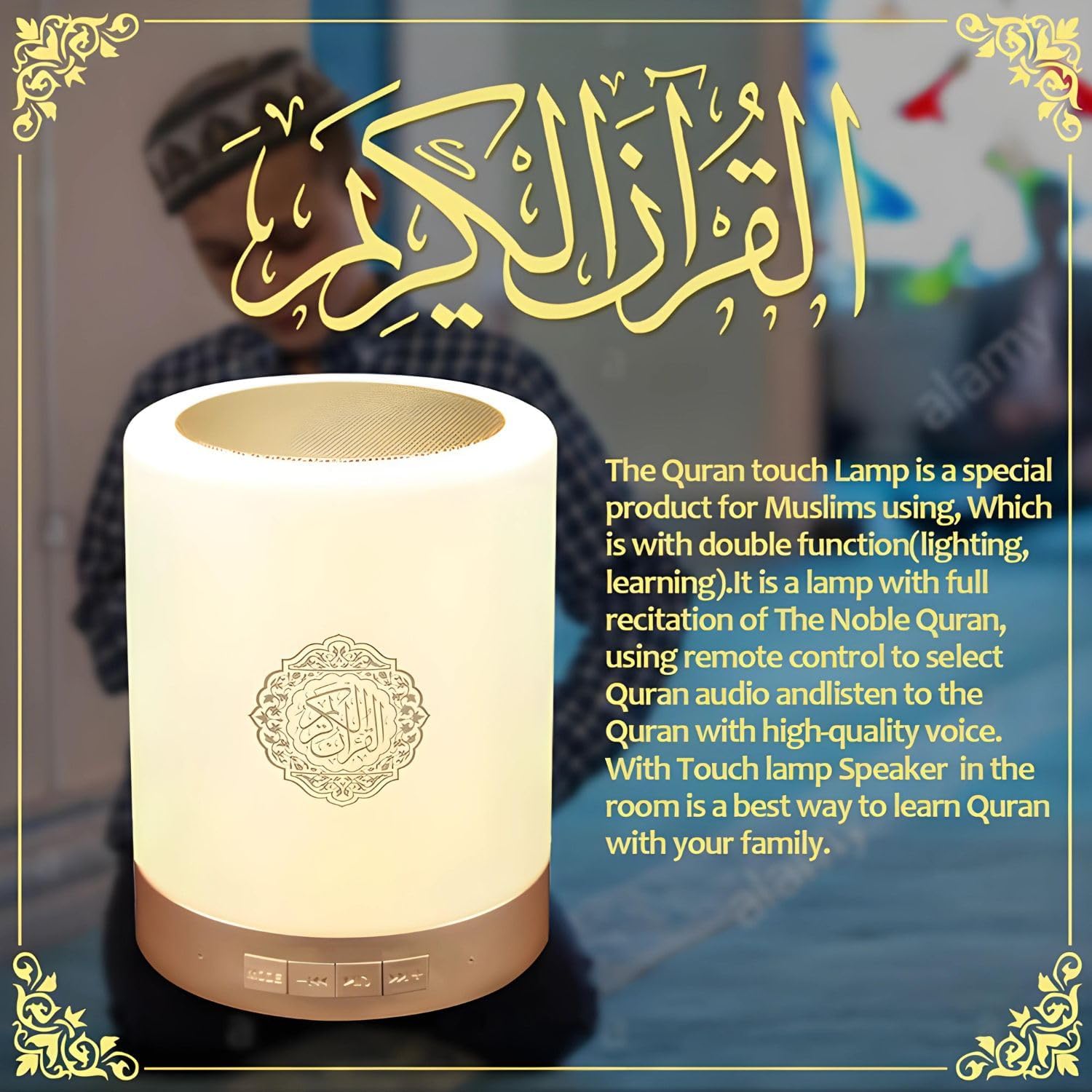 Smart Touch LED Lamp with Quran Bluetooth Speaker, Remote Control, Rechargeable, Featuring Full by 25 Reciters with 15 Languages Translations