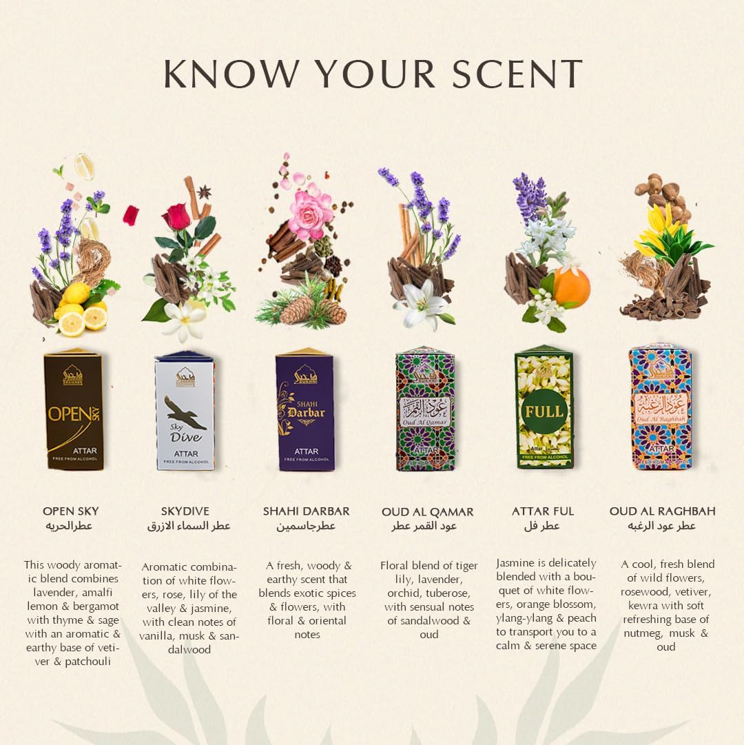 SHAHI DARBAR -A fresh, woody & earthy scent that blends exotic spices & flowers. With floral & oriental notes this unisex aroma is intoxicating & hard to miss OUD AL QAMAR -A unisex, floral blend of tiger lily, lavender, orchid, tuberose. Sensual notes of sandalwood & oud give a warm, deeply alluring scent OUD AL RAGHBAH - A cool, fresh blend of wild flowers, rosewood, vetiver, kewra. The soft refreshing base of nutmeg, musk & oud energizes men & women