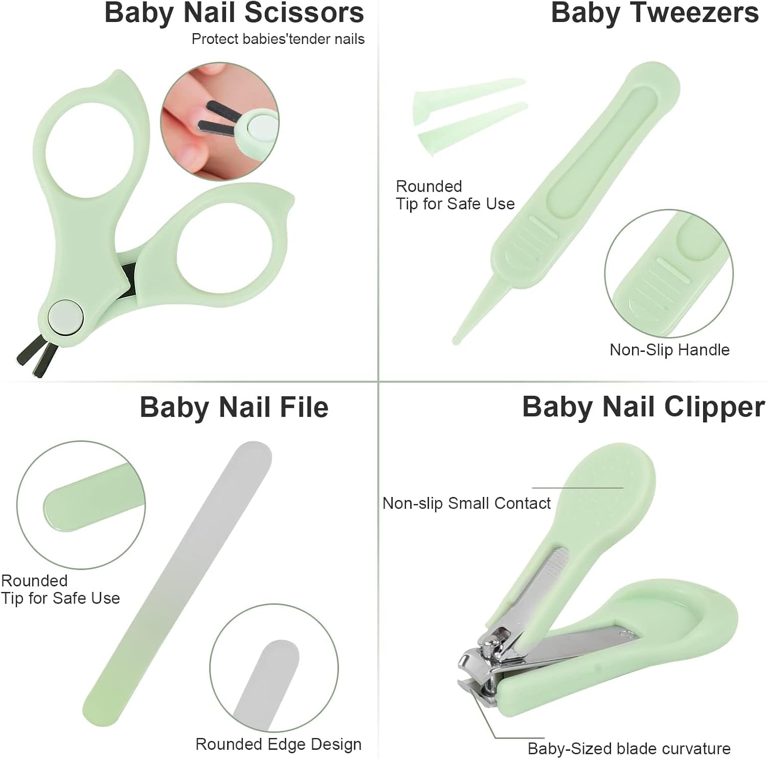 - Ergonomic DesignKids nail clippers contains a non slip small contact, and the blade curvature is in line with the characteristics of baby nails. Baby nail scissors have rounded tips, which can protect babies' tender nails. The froasted baby nail file is rounded edge design, comfortable to hold, easy to remove burrs. Baby tweezers handle non slip design, the tip is round, can easily clean the baby's ears, belly button and nose foreign objects without scratching.