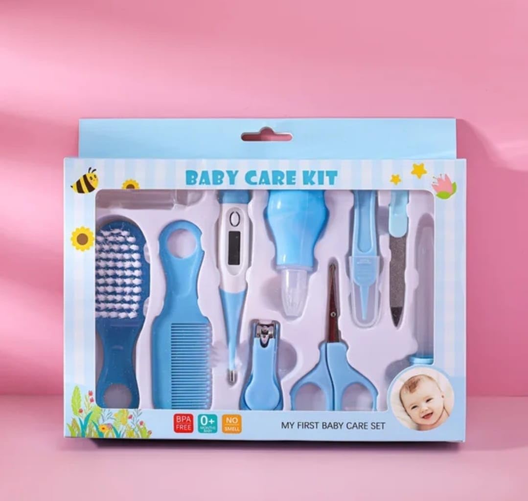 Newborn Baby Care Kit, 10 Pieces, Nail Clippers, Hair Brush, Thermometer, Safety Essentials (Blue)