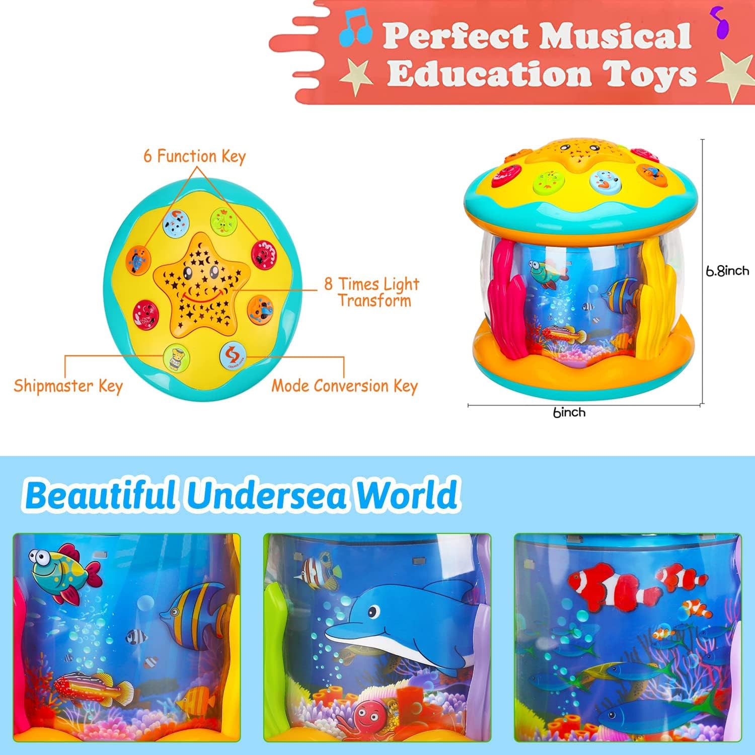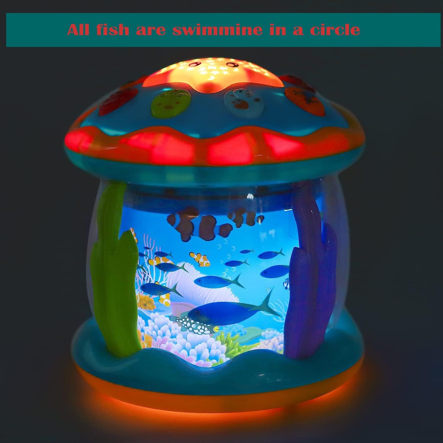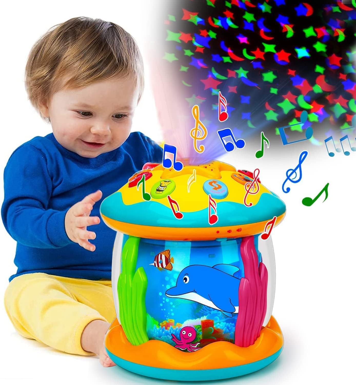 • 【360 Degree Rotating Undersea World】This baby Toys for 1 2 3 Years Old has star shape button with smiley face. Babies can easily press it and change 7 kinds of light.Various of sea animals, like dolphins, octopus, clownfish. Which can rotate 360 degrees with blue light, making baby feel like they are in a fairy tale undersea world, and stimulating babies unlimited imagination.