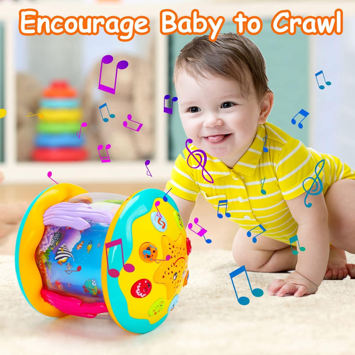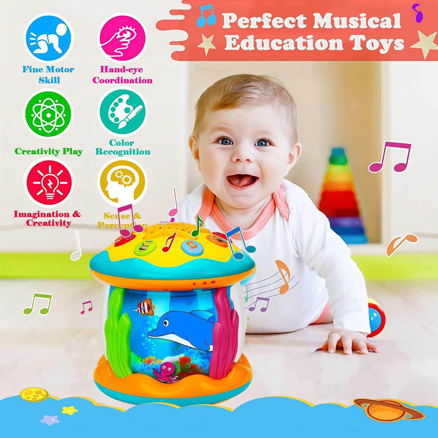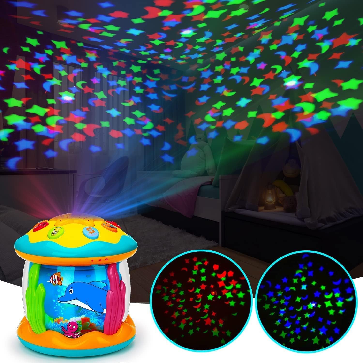 • 【360 Degree Rotating Undersea World】This baby Toys for 1 2 3 Years Old has star shape button with smiley face. Babies can easily press it and change 7 kinds of light.Various of sea animals, like dolphins, octopus, clownfish. Which can rotate 360 degrees with blue light, making baby feel like they are in a fairy tale undersea world, and stimulating babies unlimited imagination.