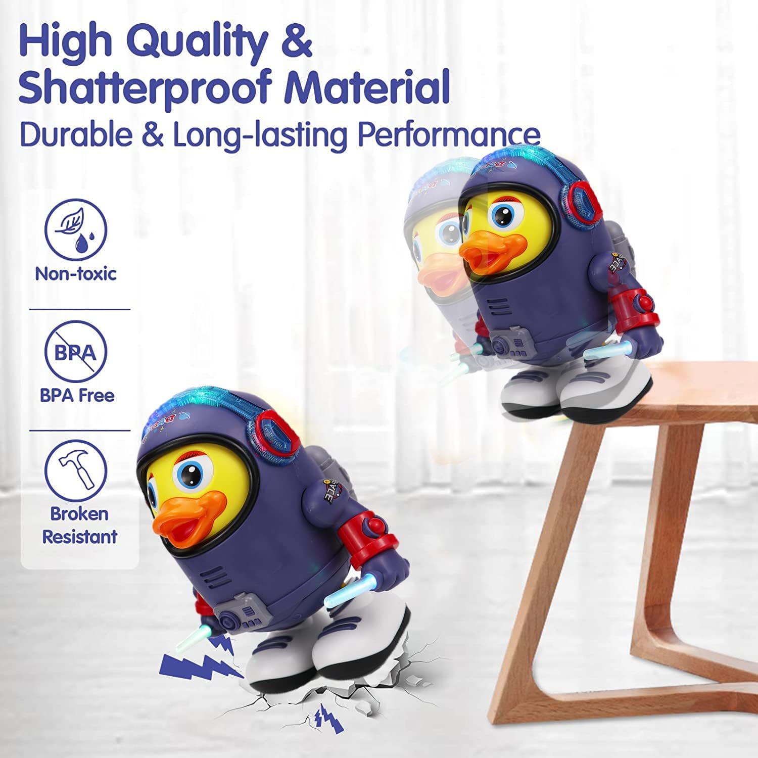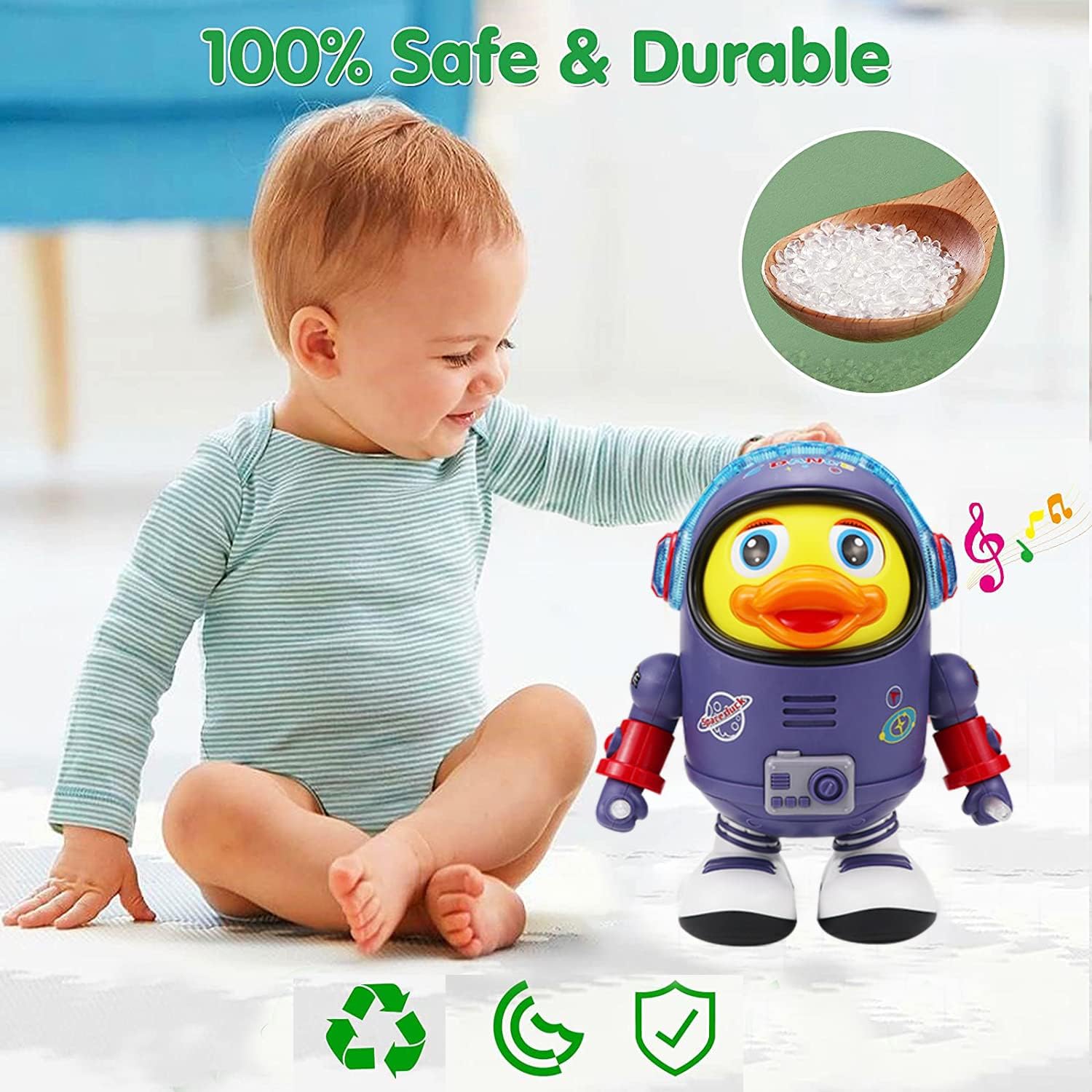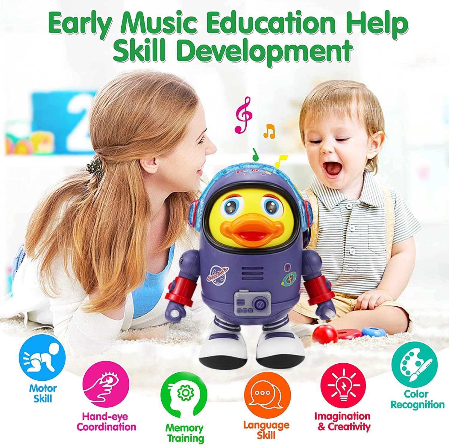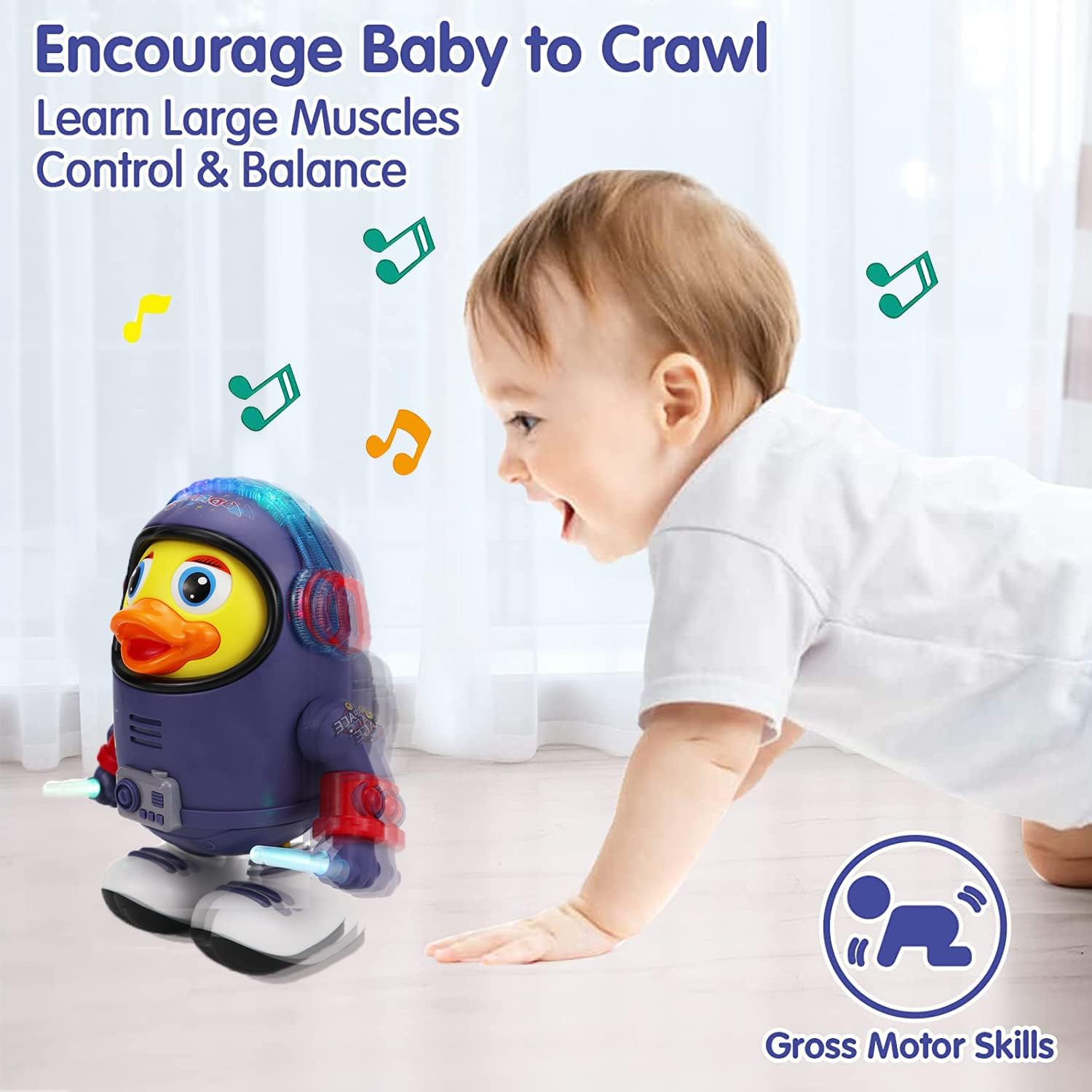 - 【Baby Musical Toys with Lights & Sounds】The cool ducky shape and bright colors are always easy to attract baby's attention.Switching on, the dancing ducky musical toys will move, swing arms, wiggle hips and shake heads with play funny music and soft light, it will attract your baby to chase.Perfect musical baby toys for 12-18 months girls boys toddlers to develop their gross motor skills, thigh muscles and body balance.