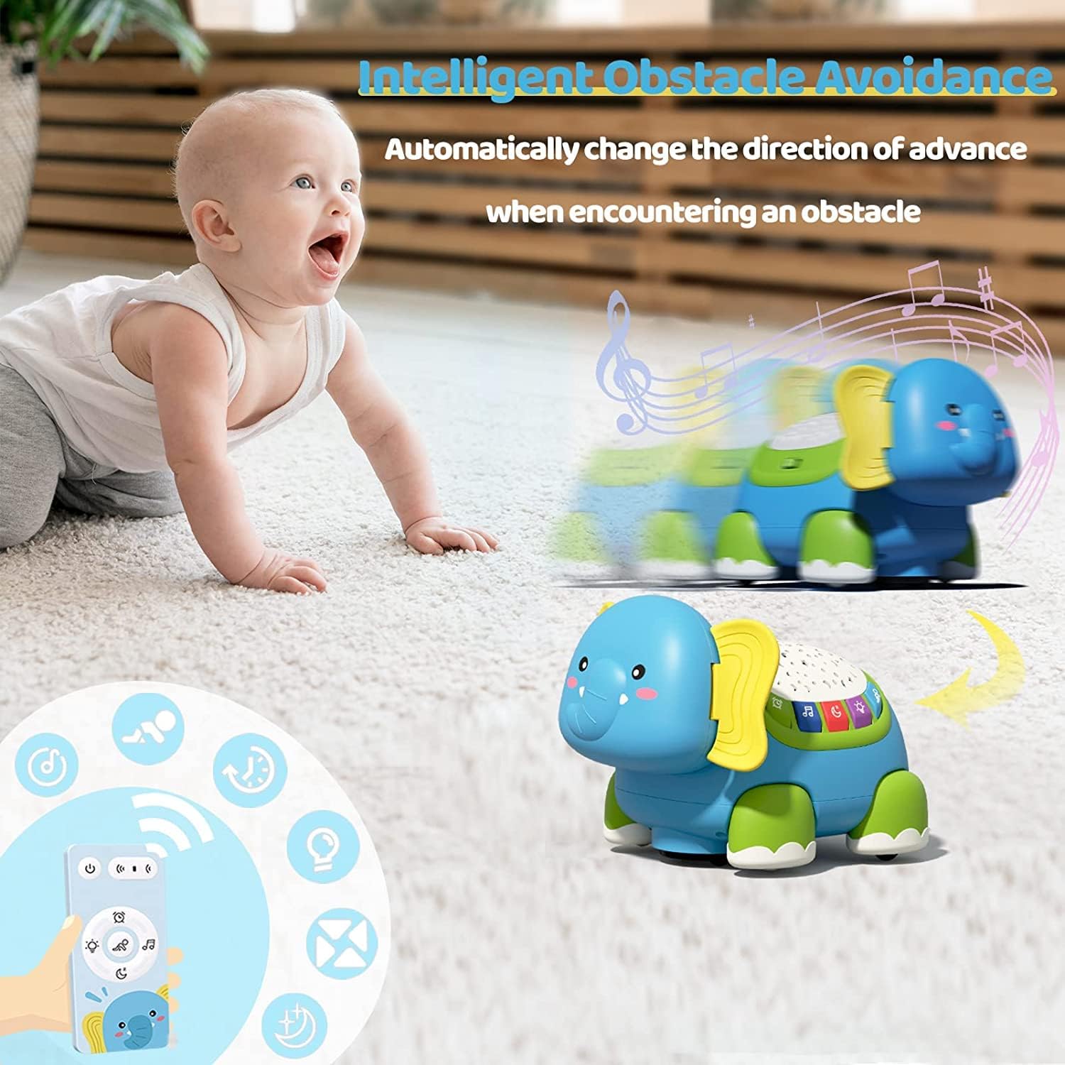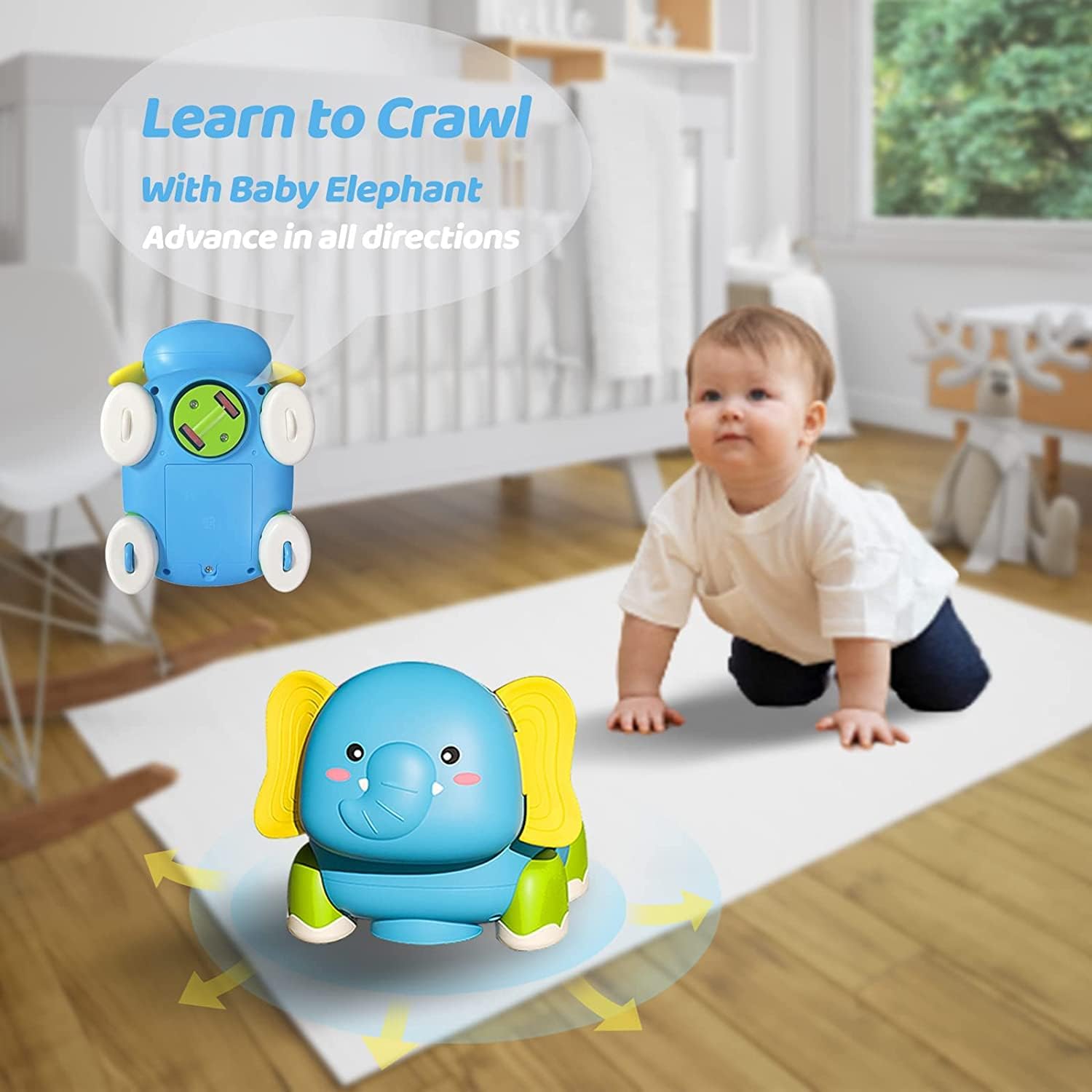 - đăEncourage Baby to CrawlăJust Tapping the button, this elephant musical toy will start to crawl with joyful music and elephant calls. The flapping elephant ears and soft tail lights to attract children to crawl happily and follow, which will encourage them to learn to roll over and crawl faster; The automatic obstacle avoidance technology ensures that the toy avoids running into walls, furniture, or other objects, providing a safe and enjoyable play experience.