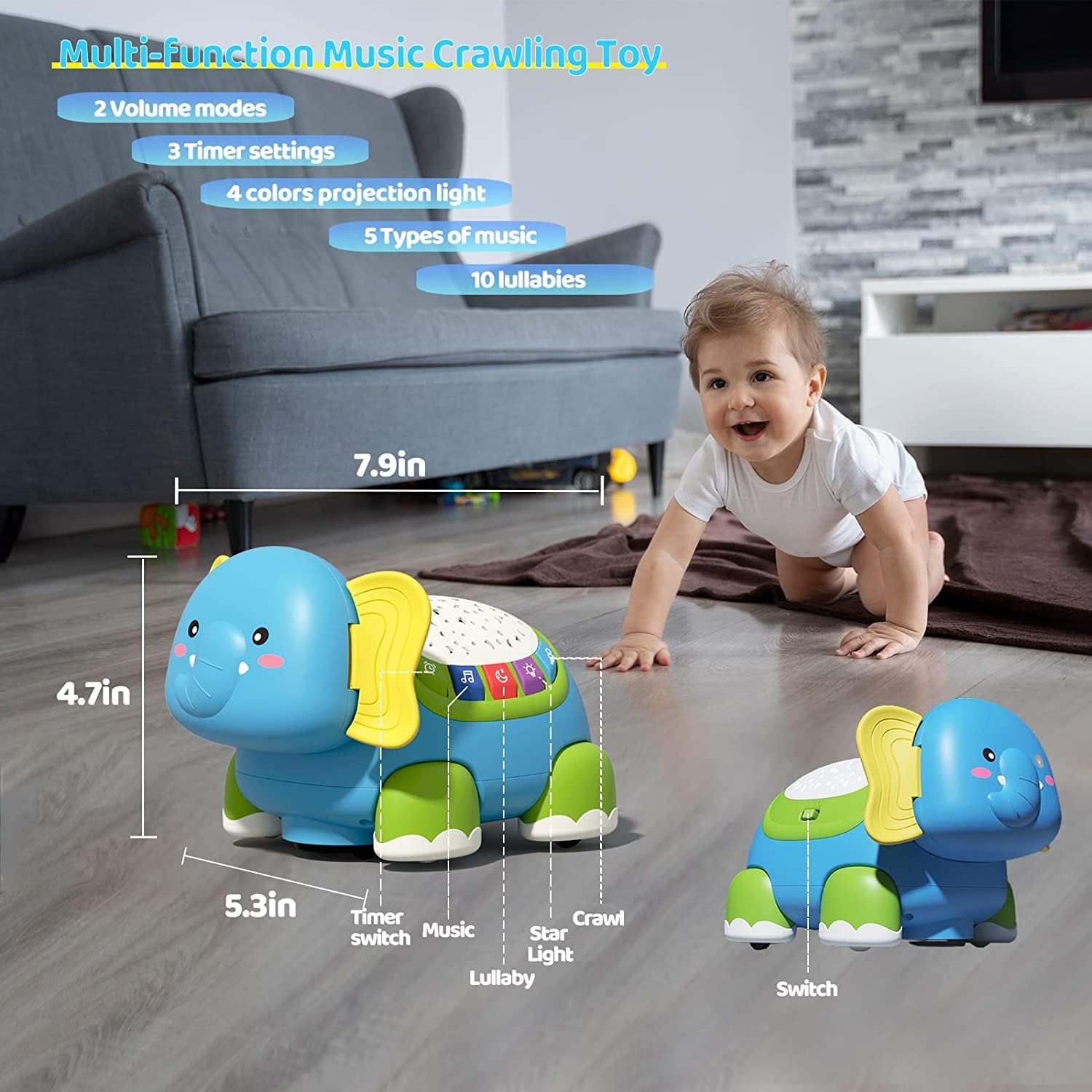- âšăMultifunctional Baby Musical ToysăOur elephant musical toy includes Five Play Modes: "Crawl mode" has two adjustable crawling speeds to encourage baby crawling, promoting motor skills development and sensory exploration. "Light mode" has 4 projection colors to attracting toddlers. "Music mode" has 10 music to soothe baby. "White noise mode" has 5 nature sounds to boost baby's sleep. "Timer mode" ,10 mins-20 mins-30 mins-off. With remote control, making it easy to control toy.