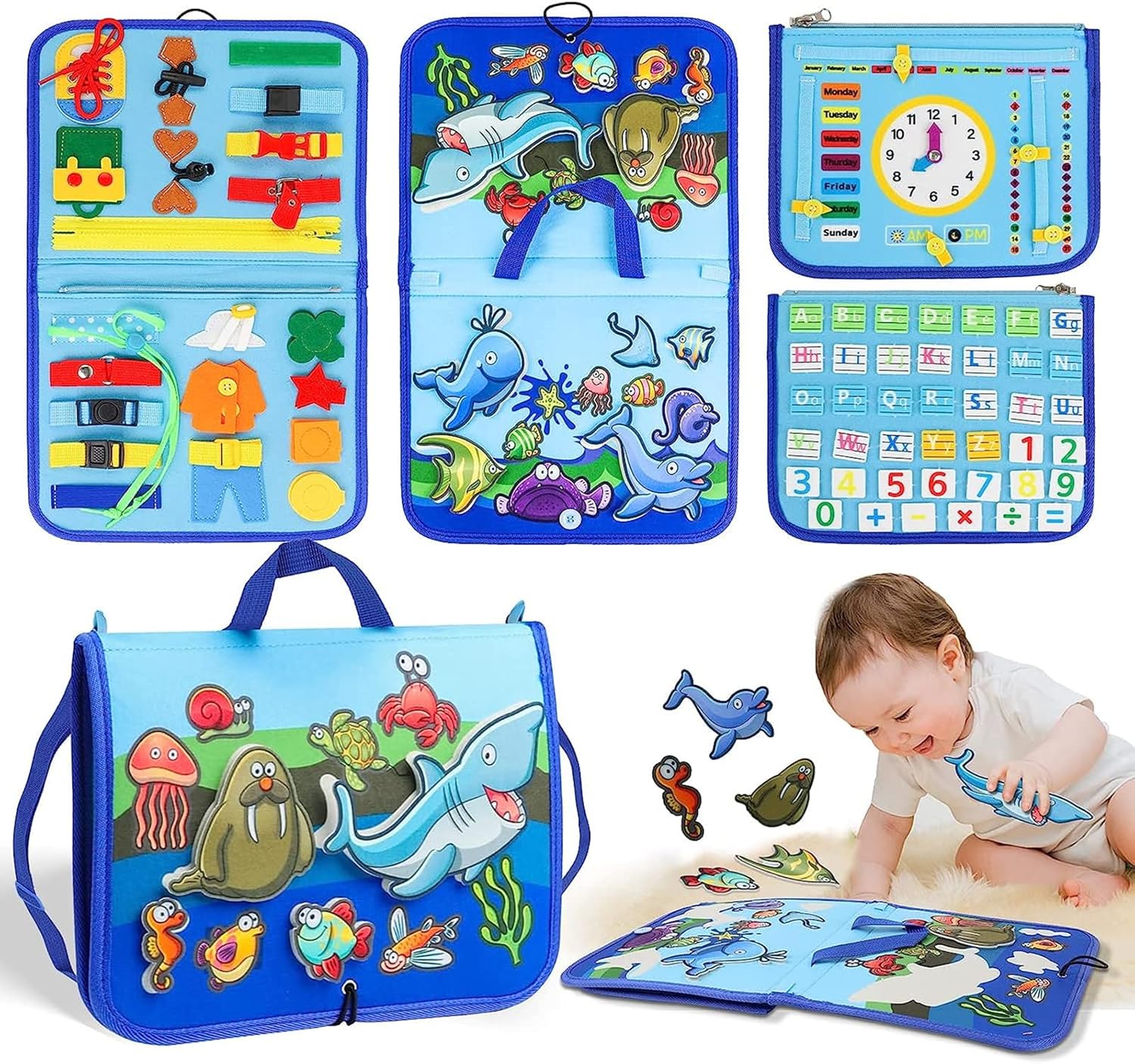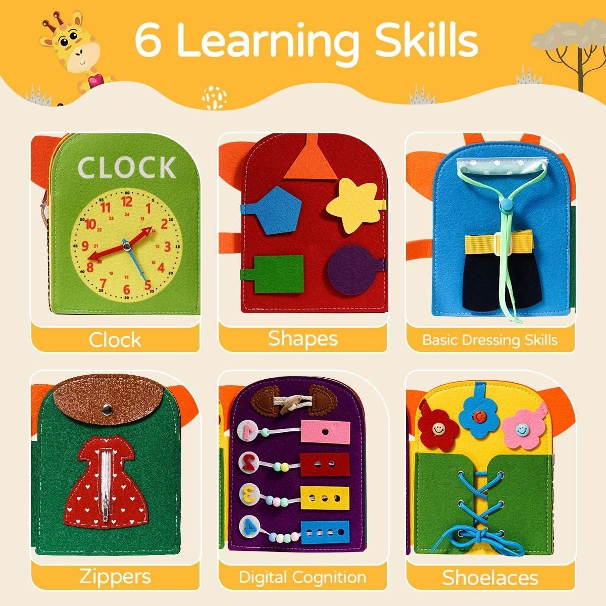 - 【2023 Upgraded Busy Board】Upgraded giraffe designed montessori busy boards for toddlers provide more functions. Our toddler sensory board has 6 pages of different activities including, zippers, shoelaces, buttons, clock, shapes and number tables.