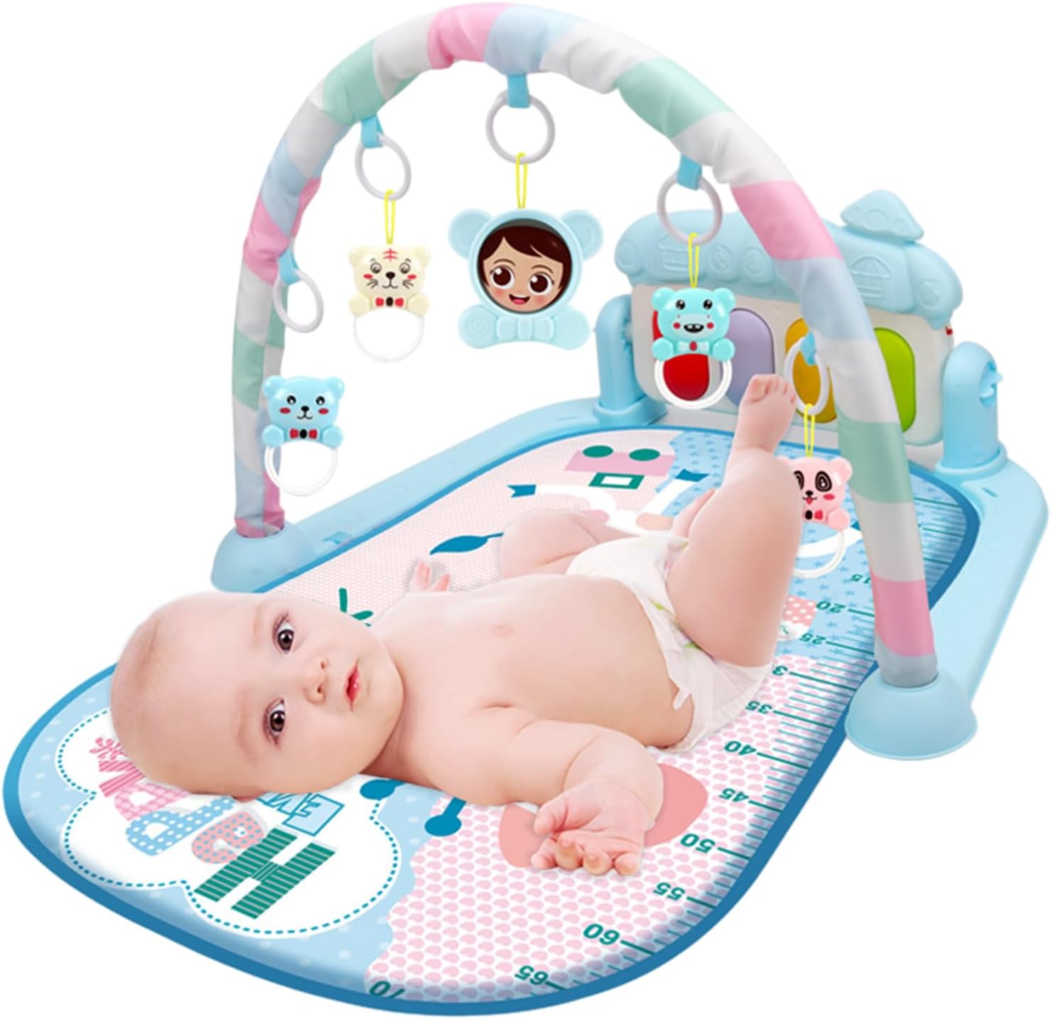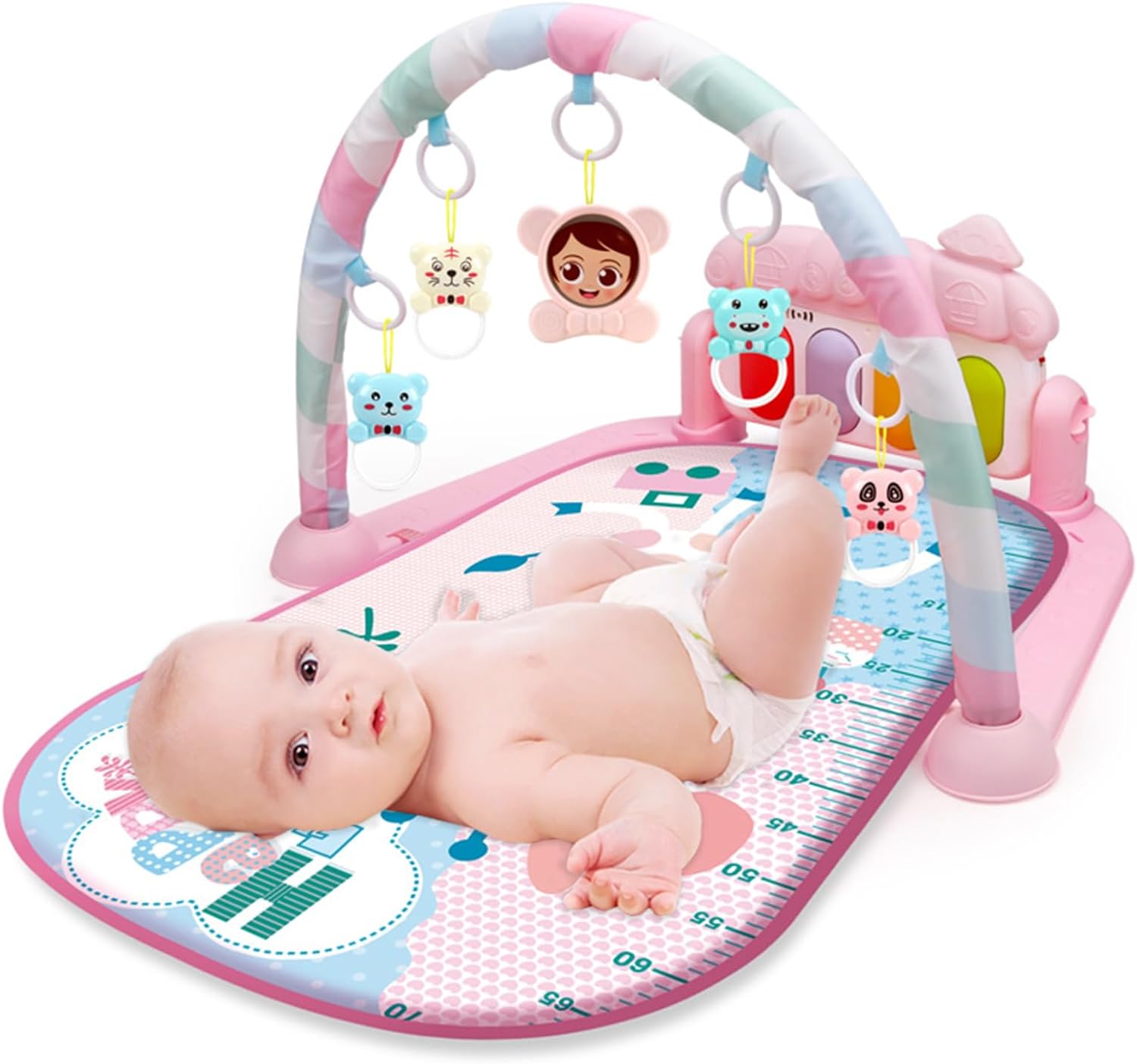 - 【Baby's Early Development Toys】Our baby gym mat comes with 5 detachable colorful baby hanging rattels and cute musical piano. Your baby will enjoy this activity center and his sensory and physical coordination skills can be improved through kicking the keyboards or catching the hanging toys.