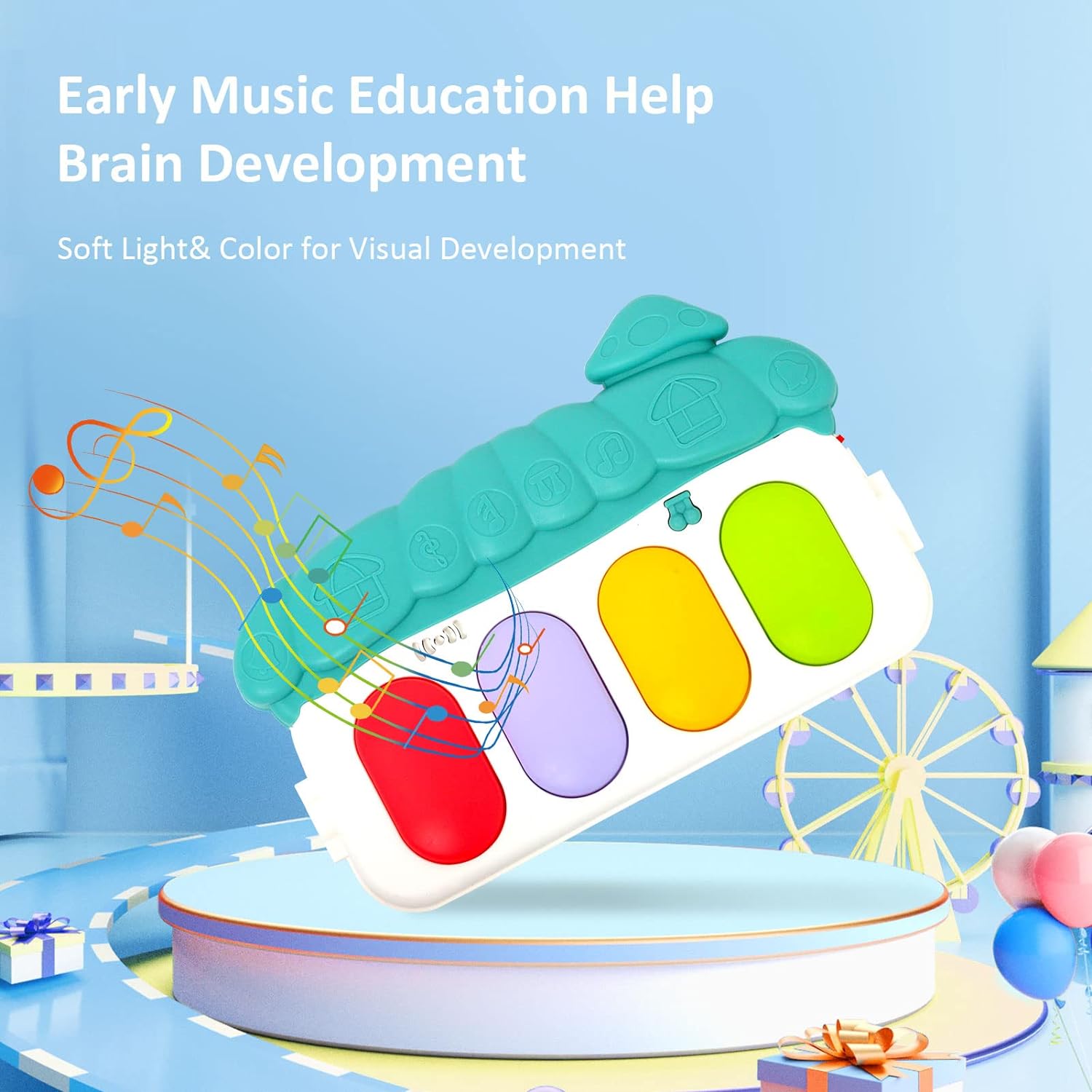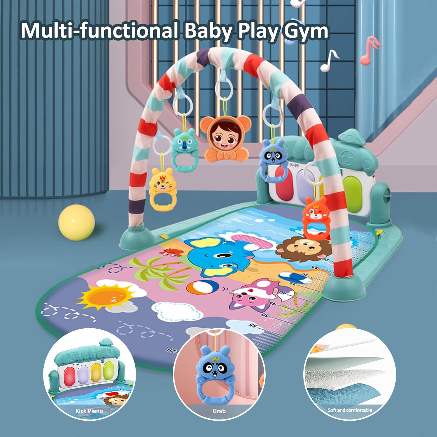 - 【Kick 'n Play Piano Gym】Our baby gym has 5 different modes of play: Lying, Sitting, Tummy Time, Kick as well as Play & Take-Along. The unique arch and music piano attract the baby to touch and make a wonderful sound immediately, it will make baby's curiosity; There are 3 music modes,---in order to improve kids ability such as listening, shooting, grabing, kicking, playing.