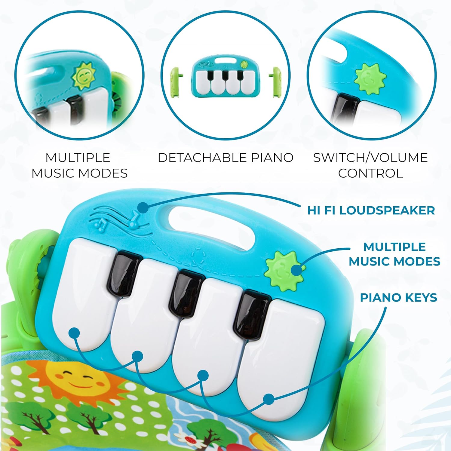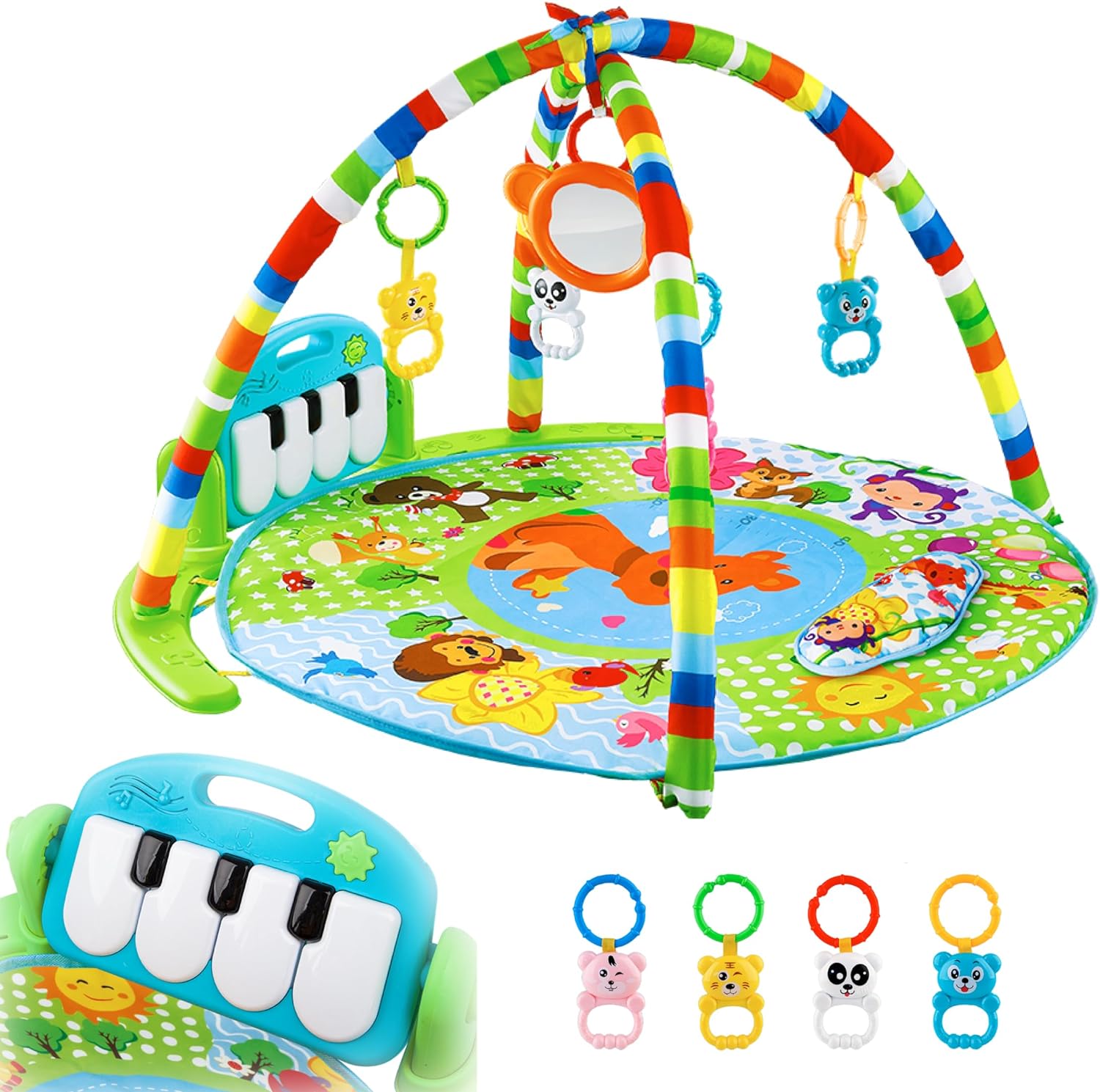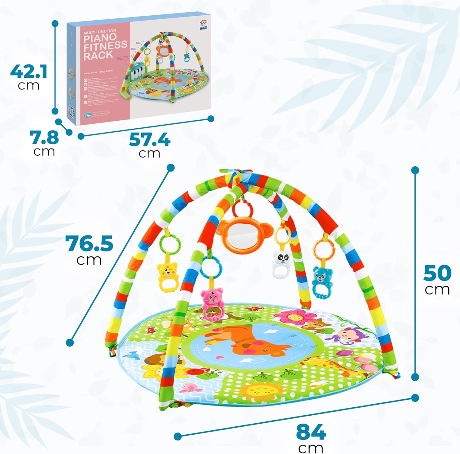The Ultimate Baby Play Mat for Your Little One's Development and Fun! Transform your baby's playtime into an engaging and stimulating experience with our revolutionary developing baby mat. Designed with utmost care and attention to detail, this play mat will quickly become your baby's favorite place to explore, learn, and play! Key Features: Interactive Rattle Toys: Our play mat features four adorable rattle toys that will captivate your baby's attention and encourage their motor skills development. Removable Mirror Rings: Hang the mirror on the convenient removable rings, allowing your baby to discover their own reflection while enhancing their visual stimulation. Baby Piano: Ignite your baby's love for music with our baby piano! The piano, complete with illuminated keys, can be adjusted to different angles, providing endless entertainment and fostering auditory development. Height Meter Design: Watch in awe as your baby grows alongside our developing mat! The height meter depicted on the mat creates a delightful visual experience, capturing precious moments as your little one reaches new milestones. Portable and Easy to Store: The play mat effortlessly folds, making it convenient to store or carry along on your travels. It's perfect for creating a familiar play space wherever you go! Multi-purpose Use: Once the arches are removed, the baby rug can double as a soft bedding for cozy playtime sessions. Specifications: Developing Mat Size: 75x75x49cm Pendant Size: 8.5x6cm Piano Size: 28x19cm Complete Set: Mat, 2 Arches, 4 Rattles, 1 Mirror, Plastic Frame-Piano Holder, 2 Plastic Bolts for Piano Fixation Unlock your baby's potential with our innovative baby play mat. Whether it's tummy time, sensory exploration, or motor skill development, our play mat caters to various stages of your baby's growth.