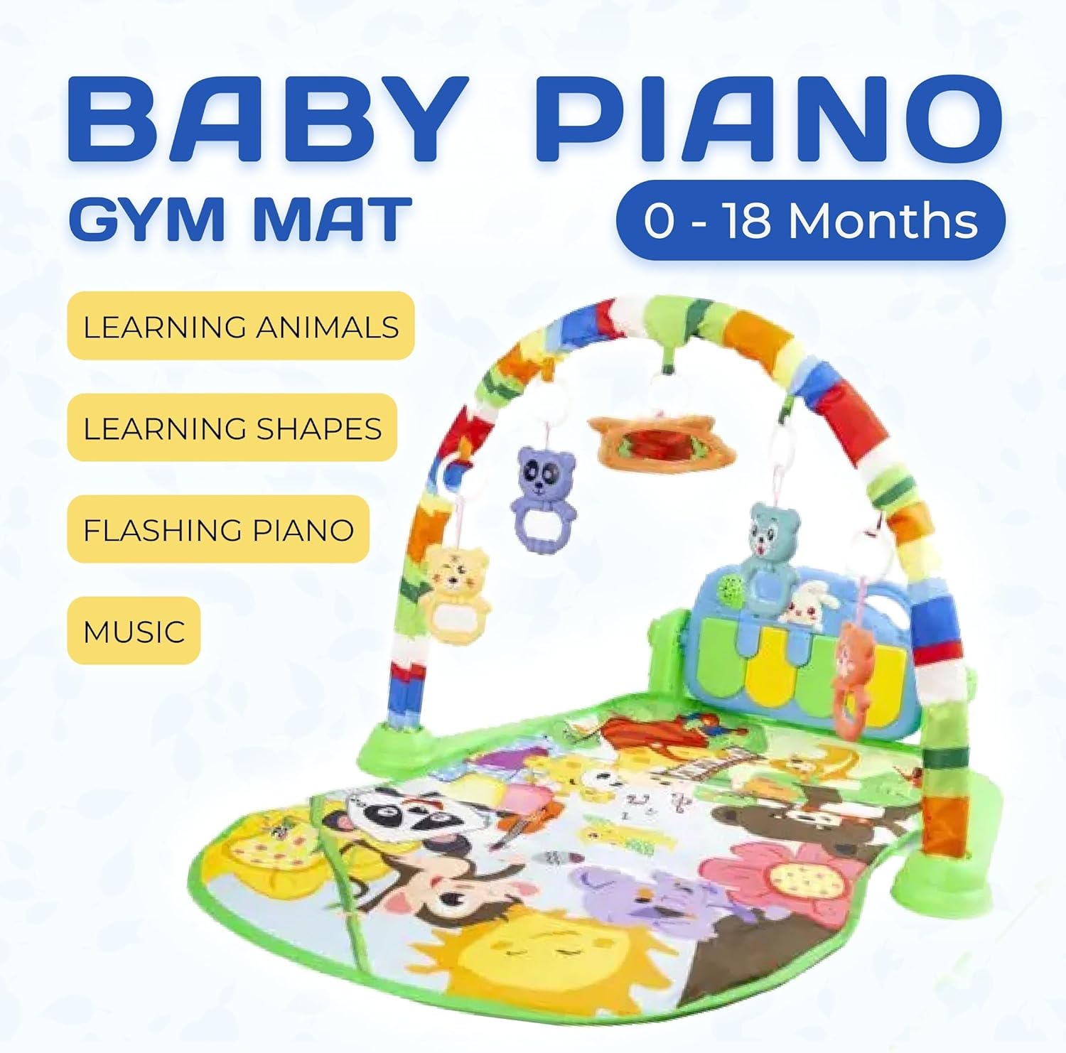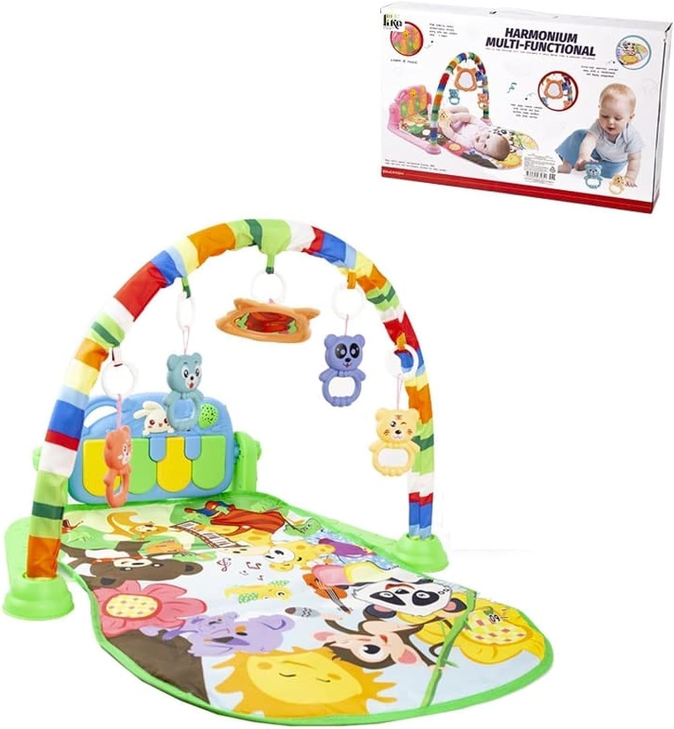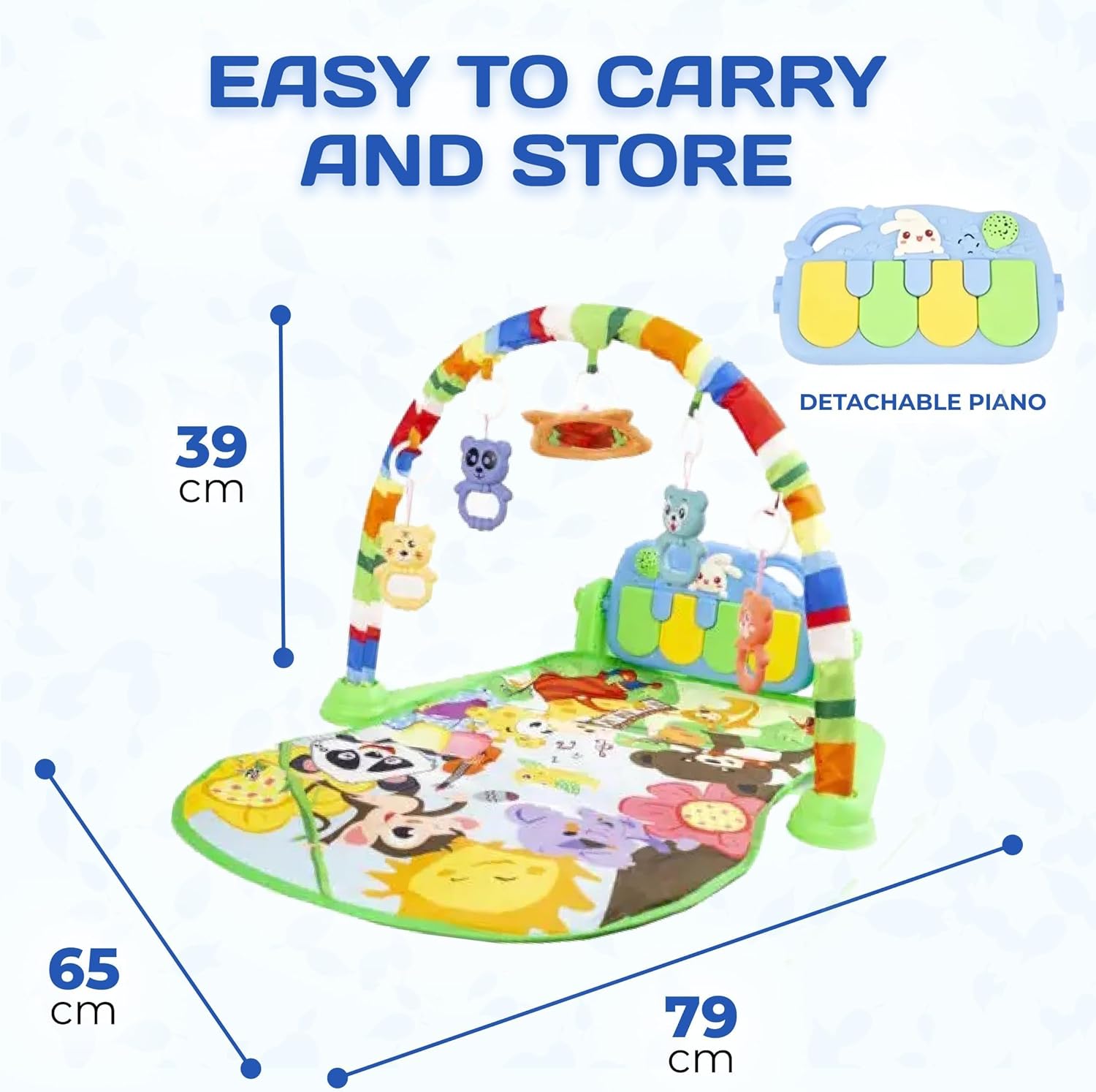 Baby Play Gym with Piano - the perfect companion for your little one's playtime and development! This baby play mat is designed to provide endless entertainment and stimulate your baby's senses. With its innovative features and high-quality construction, it's an excellent choice for newborns and infants. Featuring a unique piano play mat, this baby gym offers an exciting musical experience for your little musician. The piano comes with light and sound effects, ensuring that your baby stays engaged and entertained. As your baby plays with the accompanying rattles, they can also press the piano keys with their legs, creating a fun and interactive experience. The play gym includes four rattle toys that are securely attached with quick-release mounts. These toys not only capture your child's attention but also promote the development of fine motor skills. Your baby will have a blast grasping and exploring the rattles, enhancing their hand-eye coordination and dexterity. What sets this baby play mat apart is its jungle design. The angle of the piano can be rotated to accommodate your baby's needs, ensuring their comfort during playtime. Additionally, the music module features a soothing projection that creates a soft, subdued lighting in the room. This gentle illumination helps calm your baby and aids in faster sleep. The Baby Play Gym with Piano includes a comprehensive kit to provide everything your little one needs for an engaging playtime experience. The package includes a soft bow and a soft mat measuring 64x73cm, along with the new born baby toys with an average size of 8.5 cm. The plastic piano holder frame and two piano fastening bolts ensure the stability and safety of the piano during play.