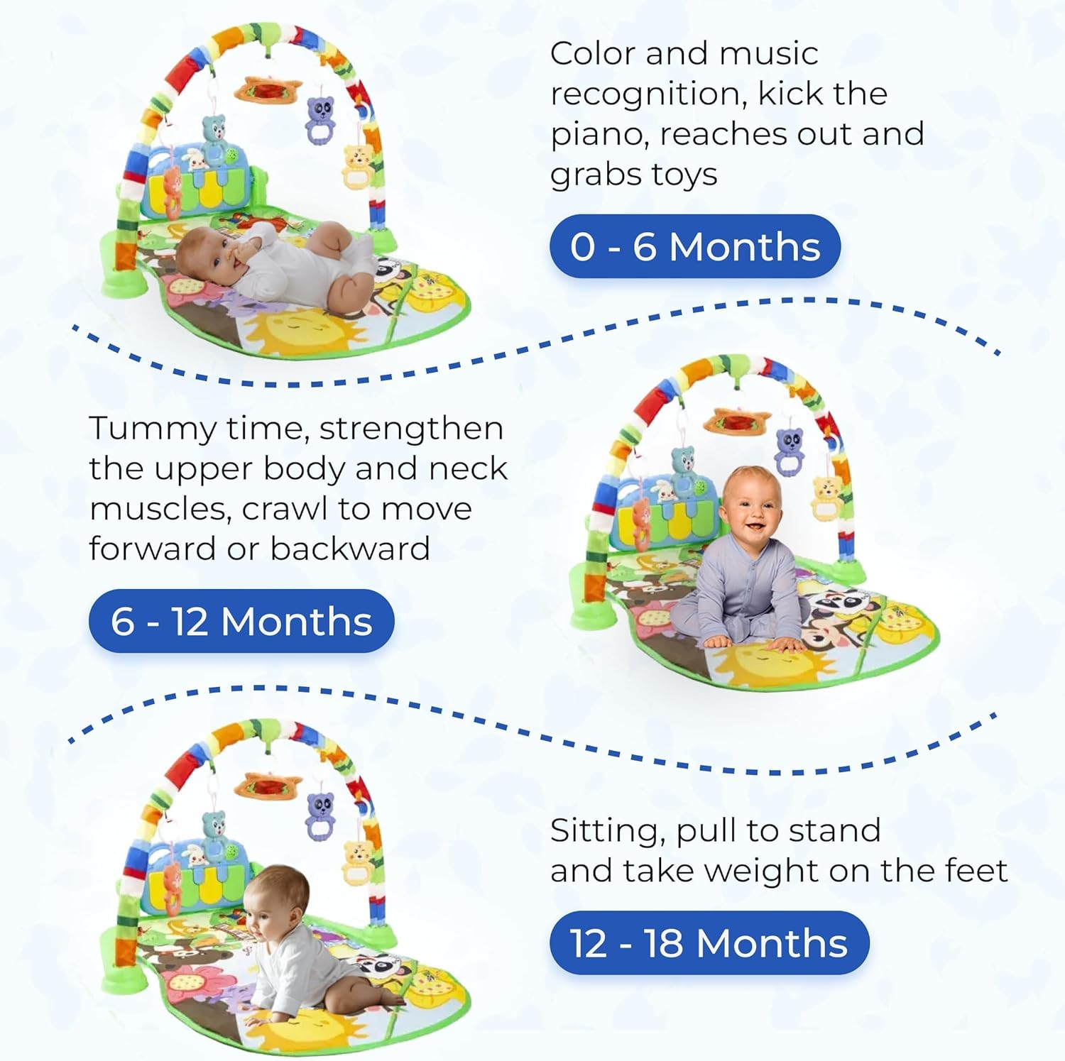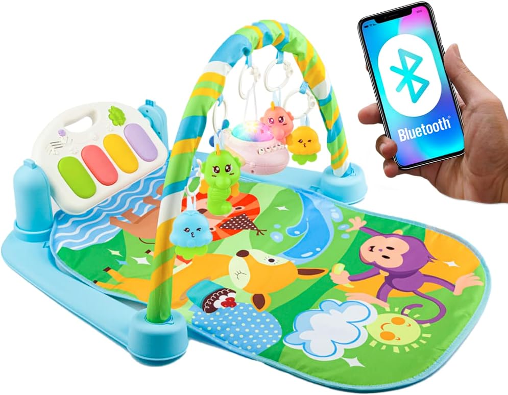 - 【Specially Designed for Babies】0-12 month baby brain development educational,The kick-activated piano is specially design for infant baby 0-12 months, its cheerful nursery music encourage baby to kick again and again. Baby play gyms encourage babies to use and develop the muscles in their arms, legs, tummy, back, and neck. It stimulates hand-eye coordination, fine & gross motor skills.