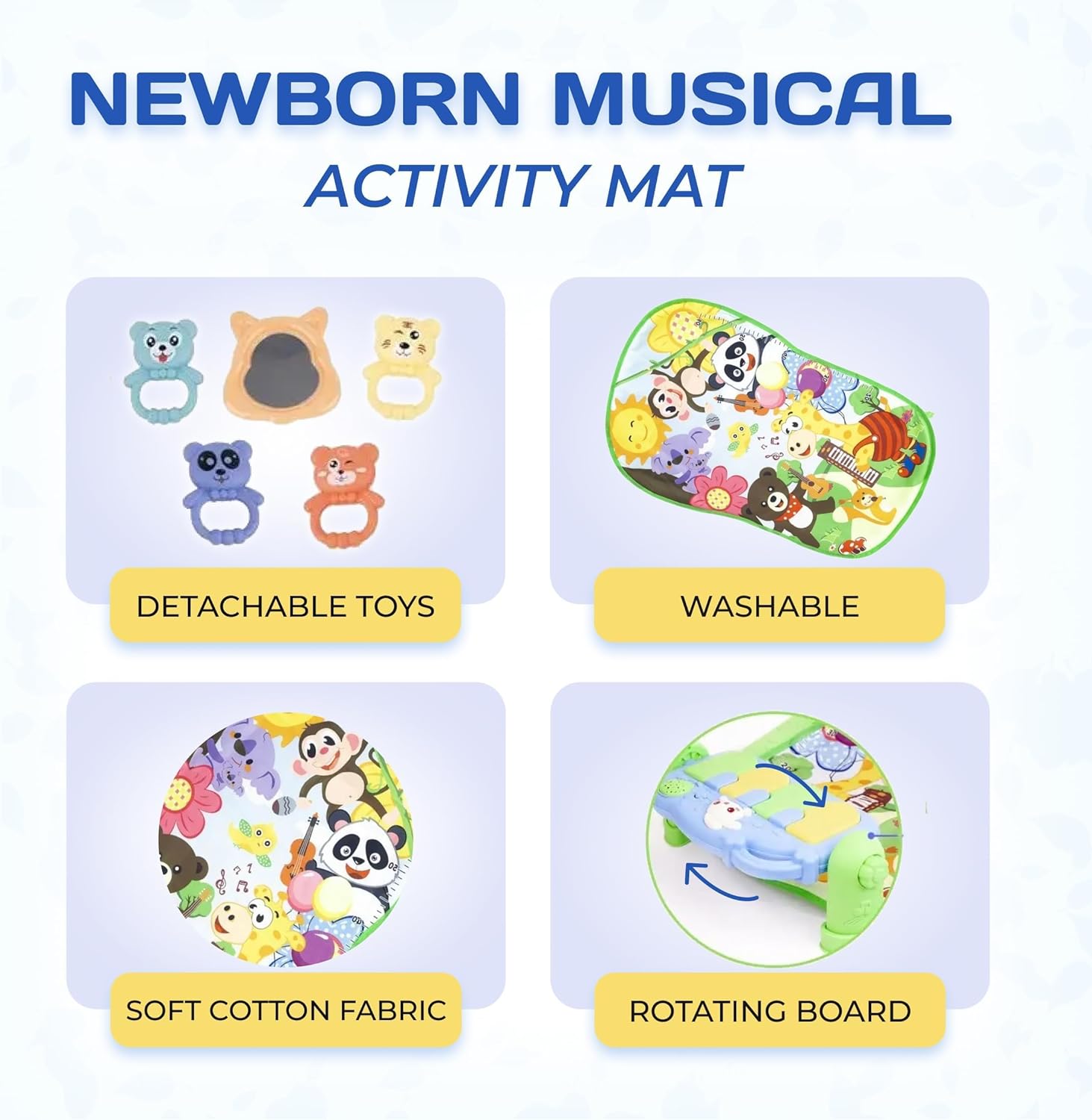 - 【Safety & Comfortable Touch】Soft & Comfortable Touch,The baby gym is made from high quality cotton & fabrics, extra thick with fine and smooth touch. It is safe and comfortable for baby skins. The baby playmat is machine-washable, easy to clean & keep hygienic.