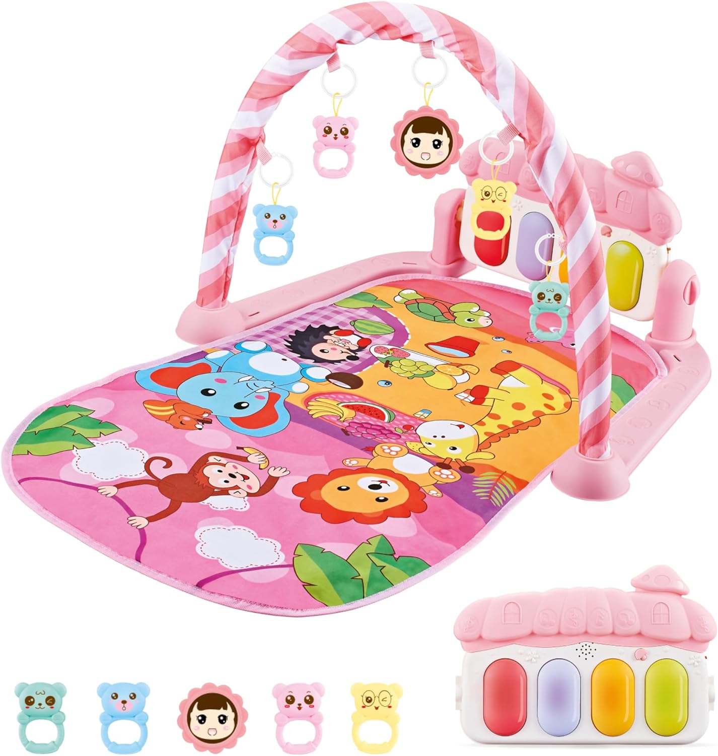 - 【Diverse Entertaining Baby Toys】This multifunctional play mat for baby featuring a kick-activated piano with music & light, with 5 adorable hanging & detachable toys, including a colorful fish, and a baby-safe mirror. The cute Baby Safe Mirror can cultivate the baby’s self-awareness from an early time.With adjustable design, piano can be fixed at any angle to fit your baby’s growth from lay & play, tummy time to sitting & play.
