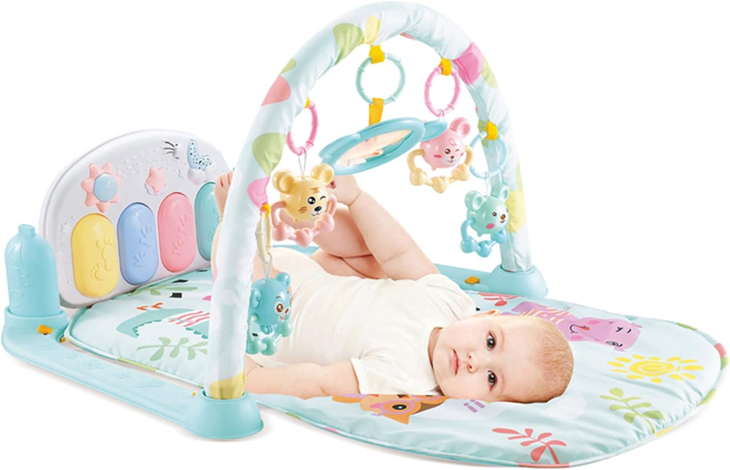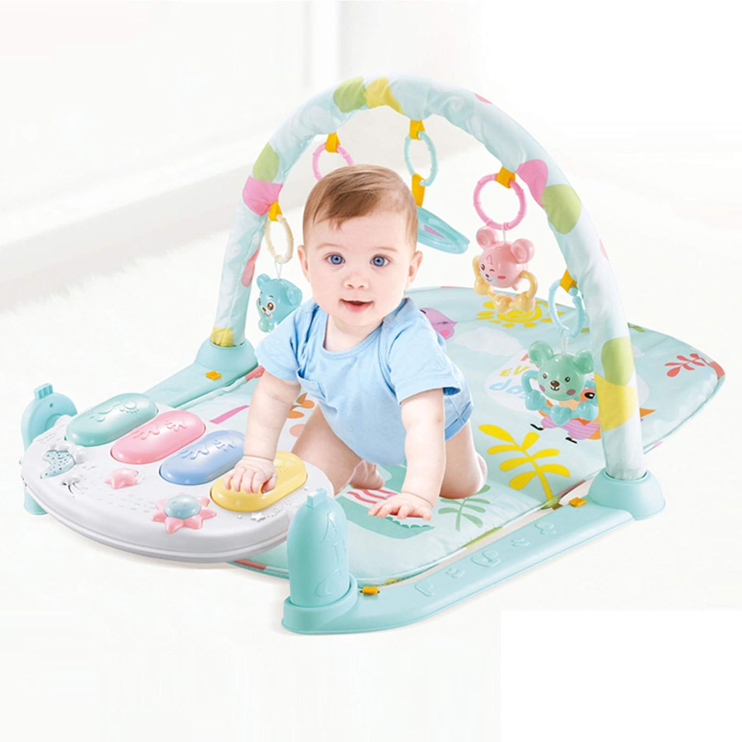 Baby Gym Carpet- Cute cartoon style,bright color,blue pink are available.- Soft mat, removable and can wash separately,,mat length about 70CM- Cute animal pendant, the baby can lie down and grab it,or remove it as a rattle.- There are two installation methods for the piano. The baby can lie down or sit up to play.DESCRIPTIONProduct Name: Baby Gym Play MatSize: 83x63x43 CMQuality: High Quality A+Material: Environmental and Healthy ABS.Material.Non toxic and tasteless.Piano Need 3*1.5V AA Battery(Not Include)Notes:1.Due to the difference between different monitors, the picture may not reflect the actual color of the item. We guarantee the style is the same as shown in the pictures.2.Please allow slight dimension difference due to different manual measurement.