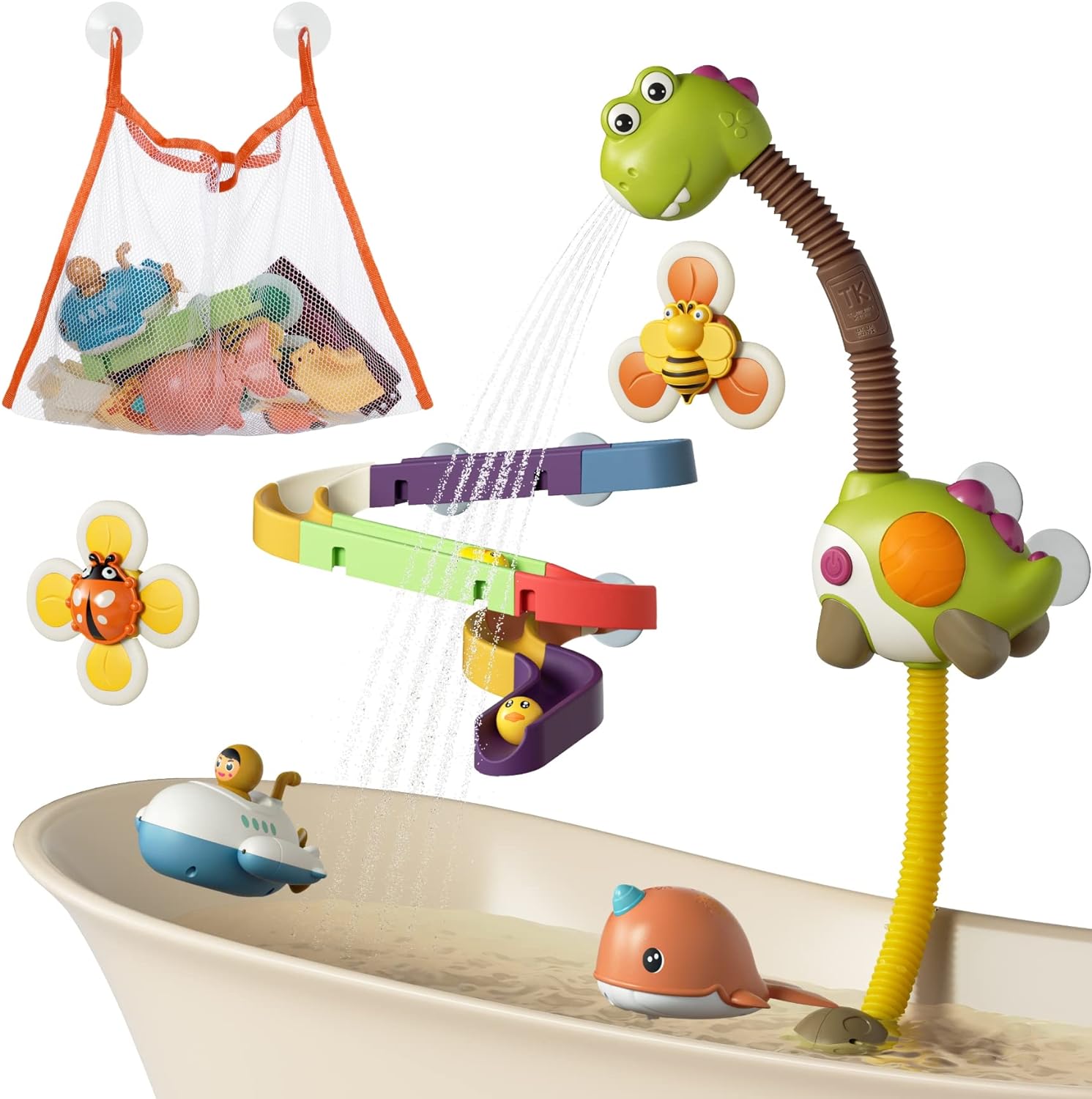 Bath Toy Bathtub Toy with Shower 2 Wind Up Toys 2 Suction Spinner Toys Storage Bag, Dinosaur Water Spray Squirt Shower Duck Toys for Toddles and Babies