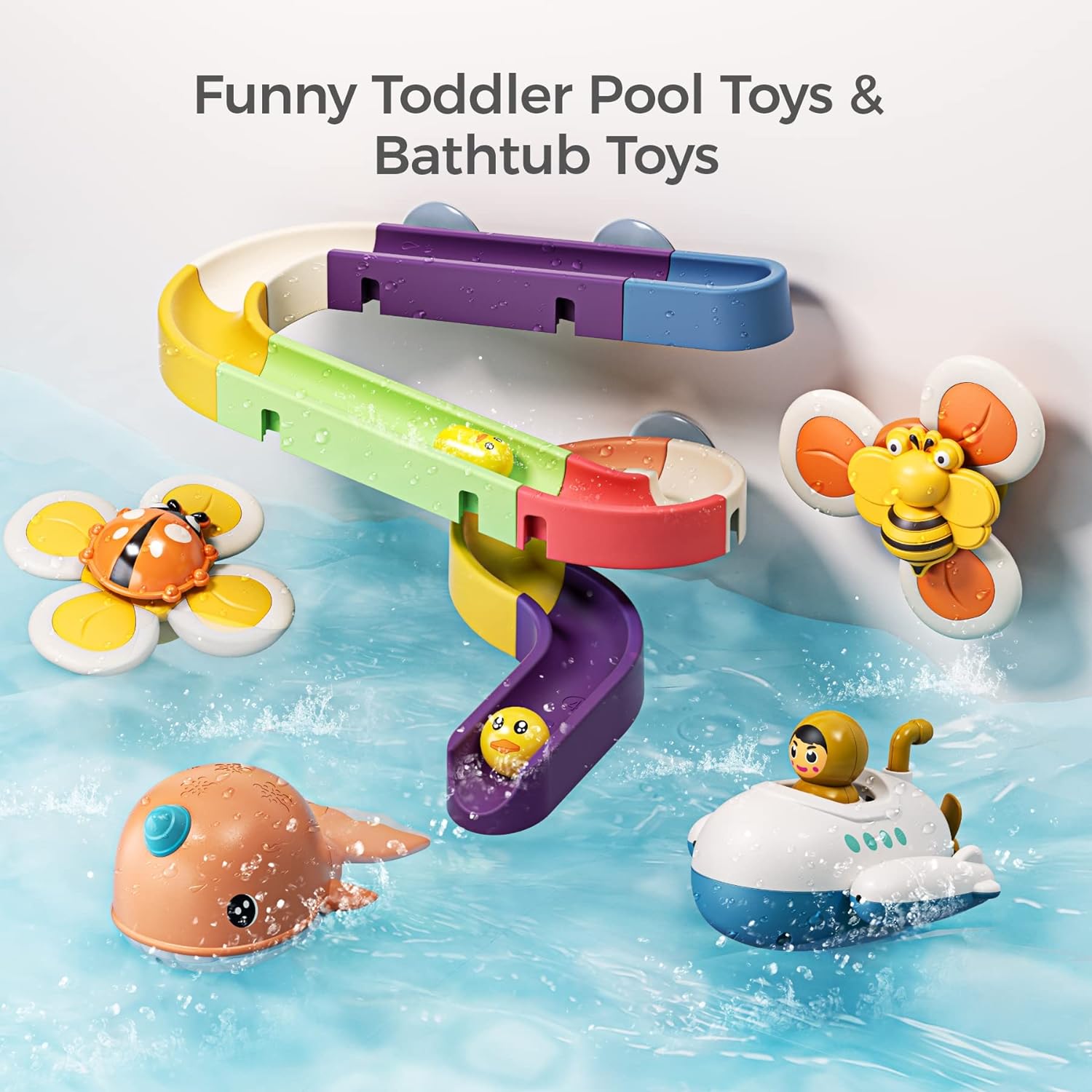 - Bath toys are specifically designed for children to play with during bath time. These toys are made from materials that are safe to use in water and are brightly colored and visually appealing to children. Bath toys come in a variety of forms, such as water slide,suction cup spinning top toys , floating boats, squirt toys, and more.