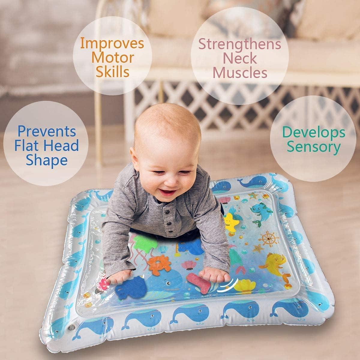 - PROMOTE BABY'S DEVELOPMENT:The Tummy time water play mat helps strengthen baby's leg and arm muscles for early development. Build a foundation for baby to meet motor milestones including rolling, sitting, crawling, and more. Helps develop hand-eye coordination, by looking down at their hands, baby is seeing how they move and what they can do.