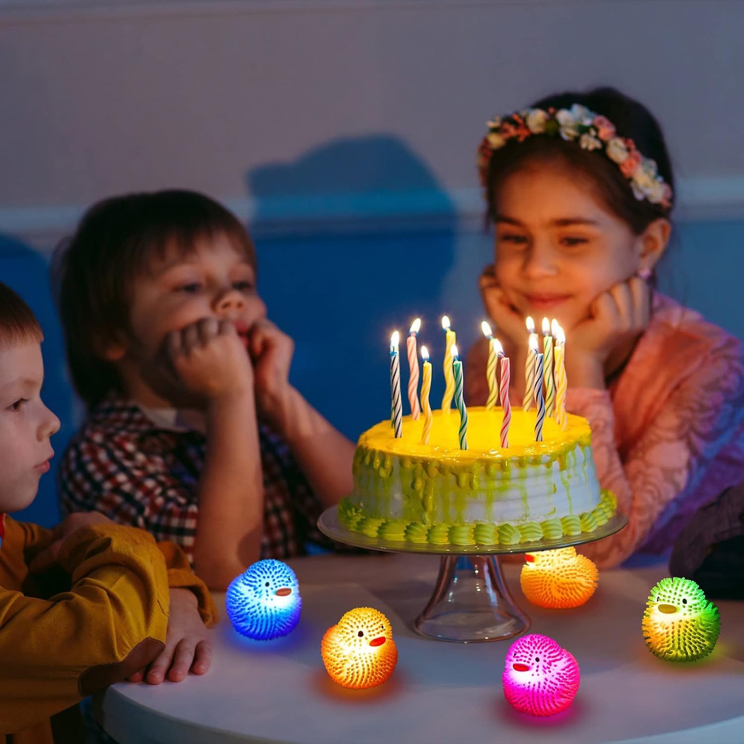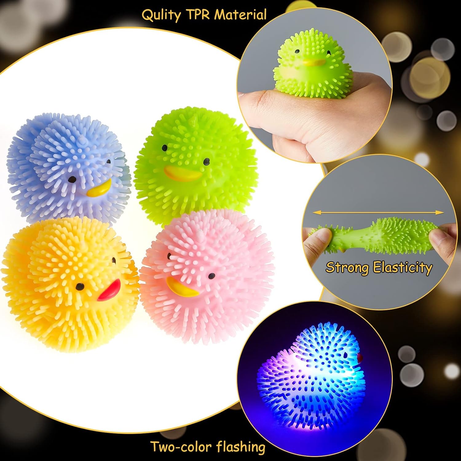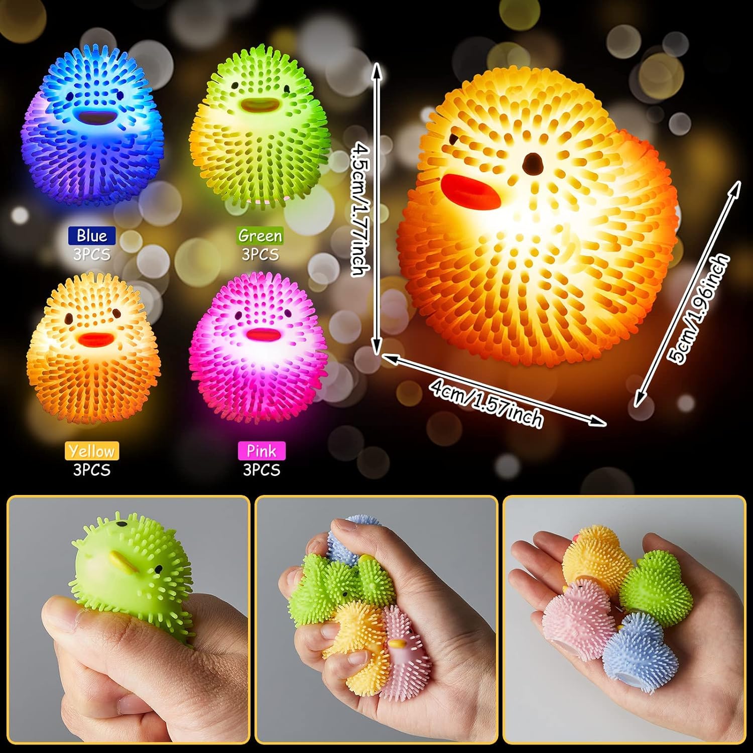 Floating Duck, Bath Toys for Kid Toddlers, 12 Pack LED Puffer Ball, Ducks Glow Balls, Small Light up Ball, Funky Flashing Ducks Bathtub, Basket Stuffers/Fillers, Classroom Prize Supplies (Color Random)FeaturesThese fun duck party supplies measure 1.96 inches and fit snugly inside your palm. They're also great as party favors for boys and girls, basket stuffers, stocking stuffers, and game prizes that little ones will love.These spiky light up balls have different flashing effects, easy to attract the eyes of boys and girls, so they are good gifts for boys' or girls' birthday or holiday, also suitable for summer parties, glow in the dark parties, birthday parties.Stress ReliefThe puffer balls set is suitable as a gadget and sensory stress reliever toy set for the little ones and adults alike; They are designed with rubber spikes that help calm and relax those suffering from anxiety.Dazzling LightThese light up duck balls can be pressed and shaken to glow in the dark; Red and blue lights alternate quickly, colorful, bright and vibrant, able to draw constant attention.SpecificationsMaterial: TPRSize: about 5 cm/ 1.96 inchesPackage Includes12 x Duck LED puffer balls