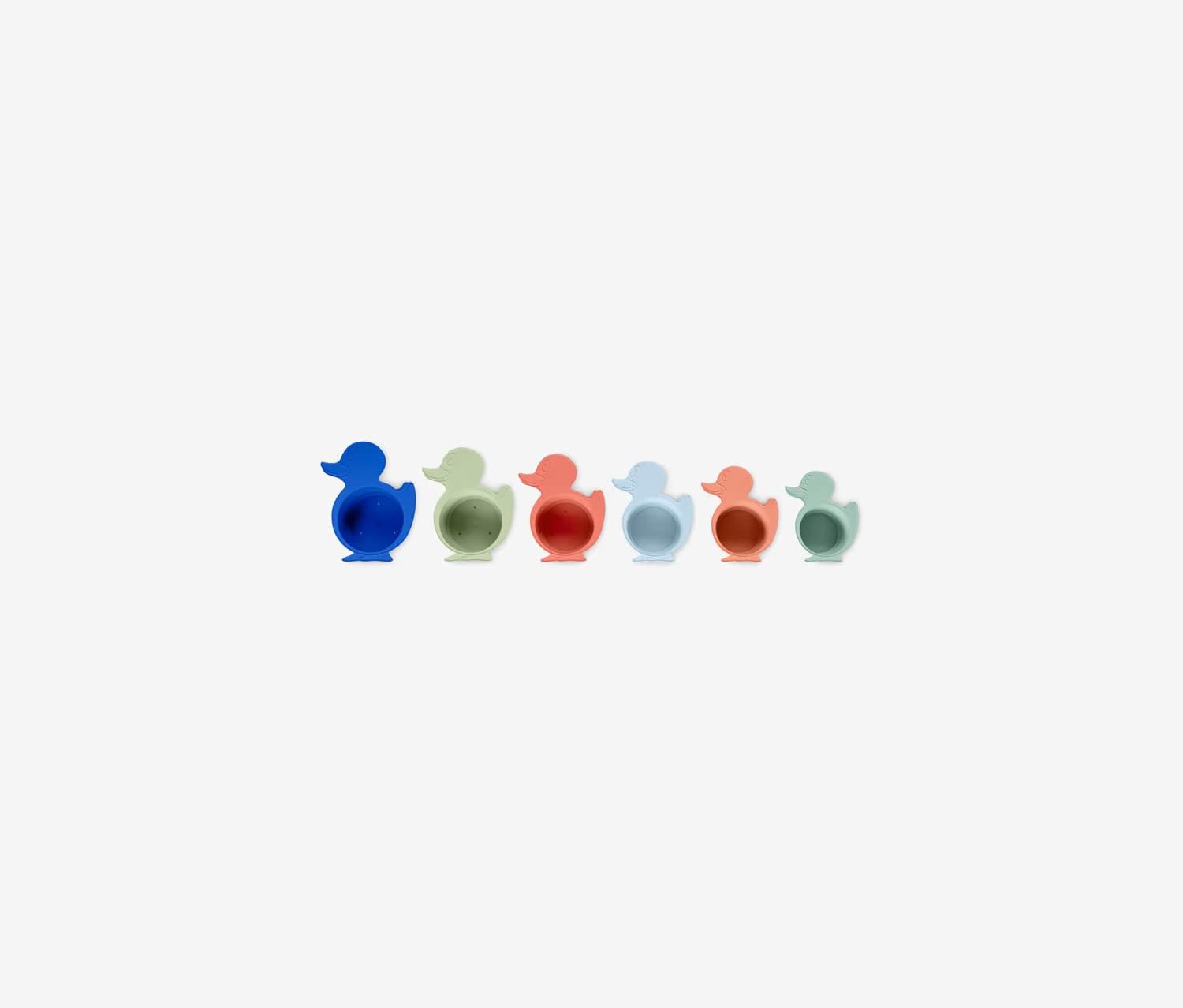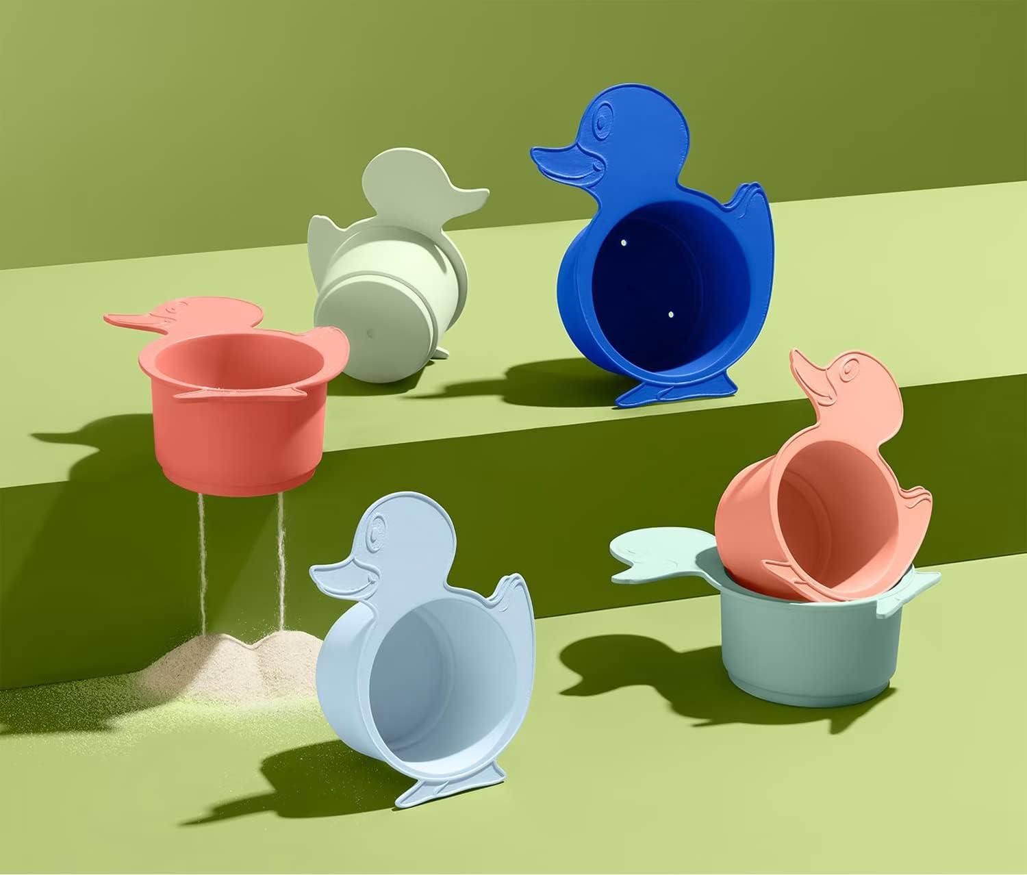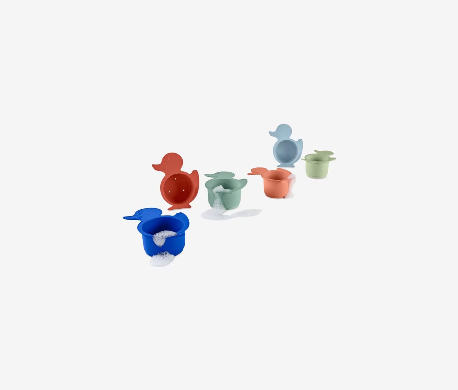 Where there is water, sand and mud, fun is usually not far away. And with these six colorful, duck-shaped sand play cups, it becomes particularly diverse. The molds are suitable for playing with sand on the beach as well as for splashing around in the bathtub at home. Three of them are closed at the bottom, the other three have holes for the water to drain off. Their BPA-free material does not contain phthalates and is made from 85% sustainable sugar cane. And after playing, they can be stacked one inside the other to form a small turret. Until next time.