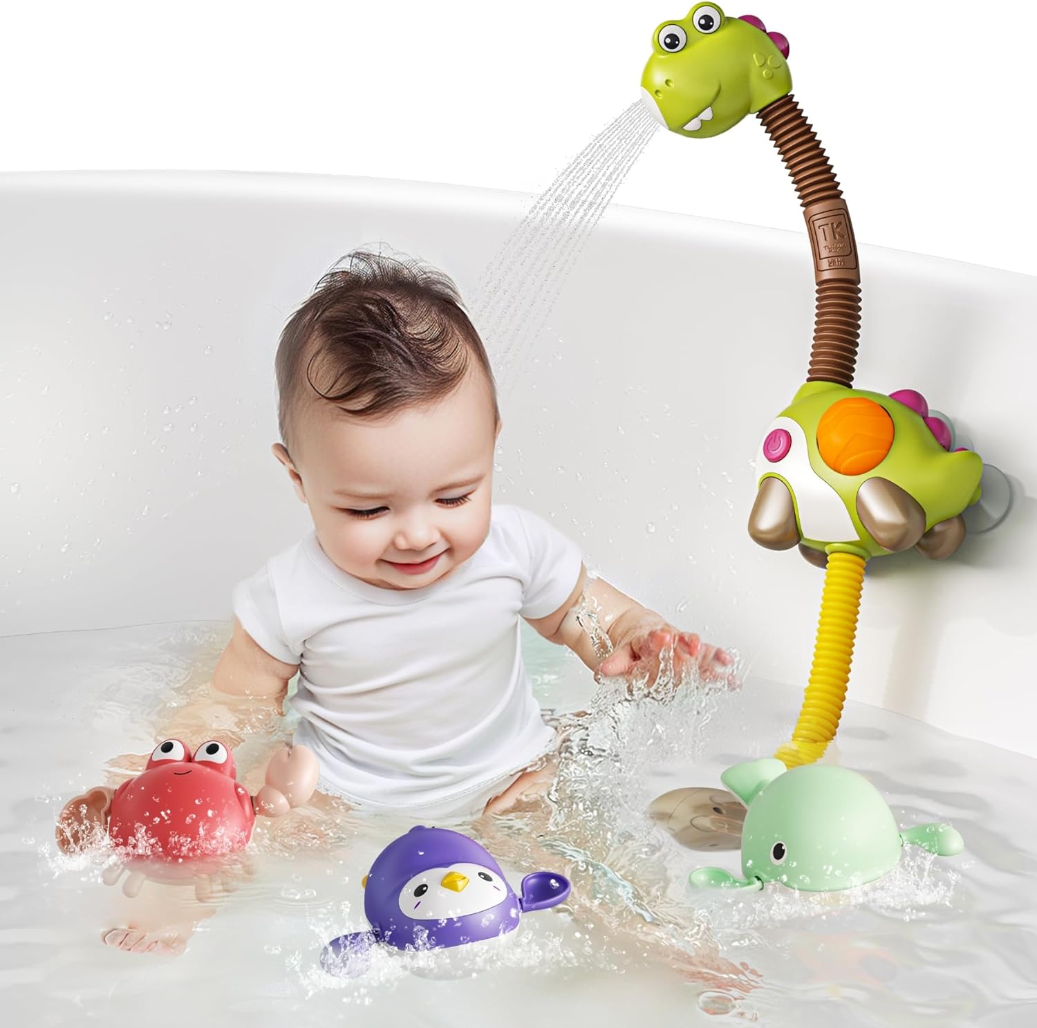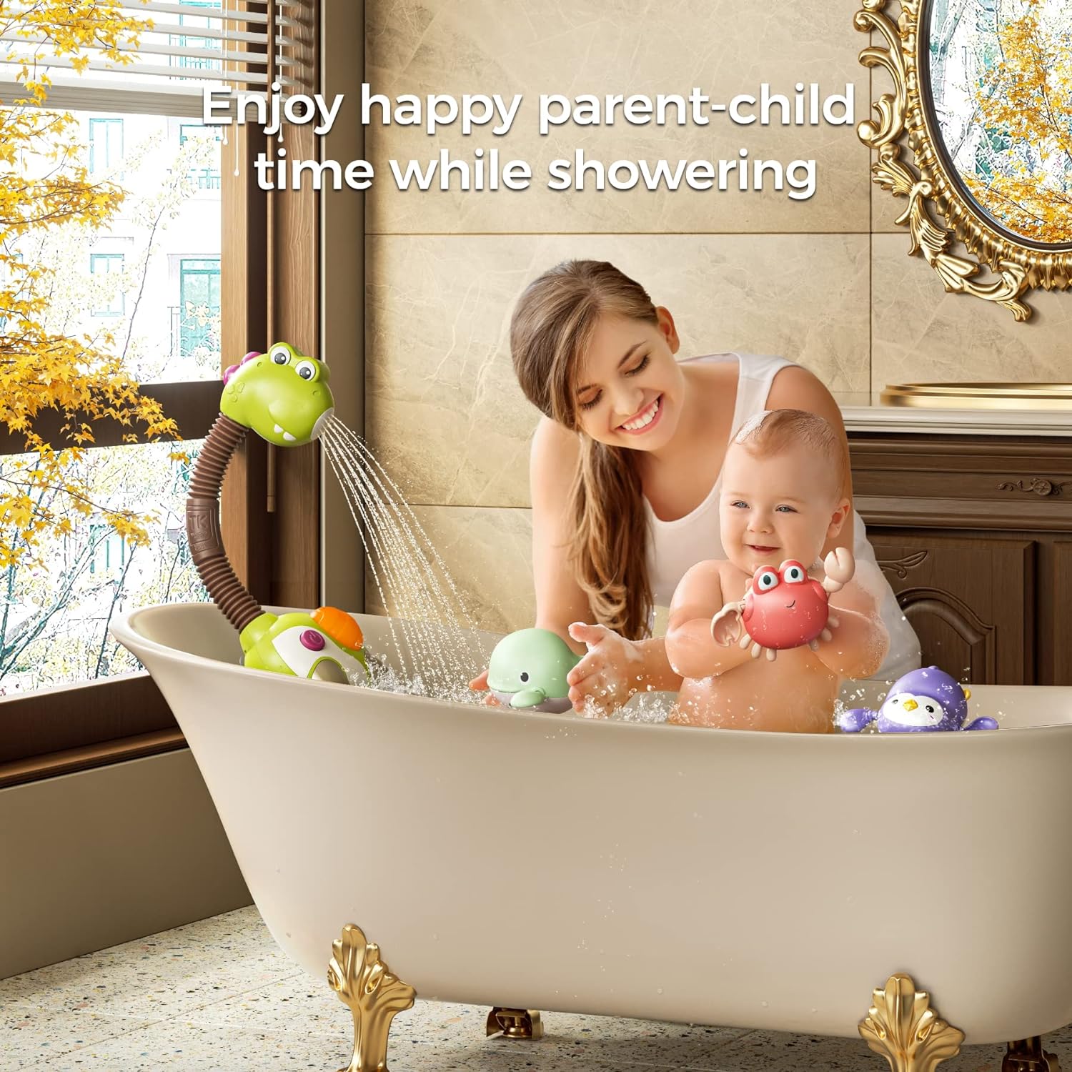 TUMAMA Baby Bath Toys with Shower Head,3 Wind-Up Swimming Toys,Squeeze Ball,Dinosaur Bathtub Water Spray Squirt Shower Faucet Water Pump Summer Essentials for Toddlers Infants Kids,Green+Wind Up Toys