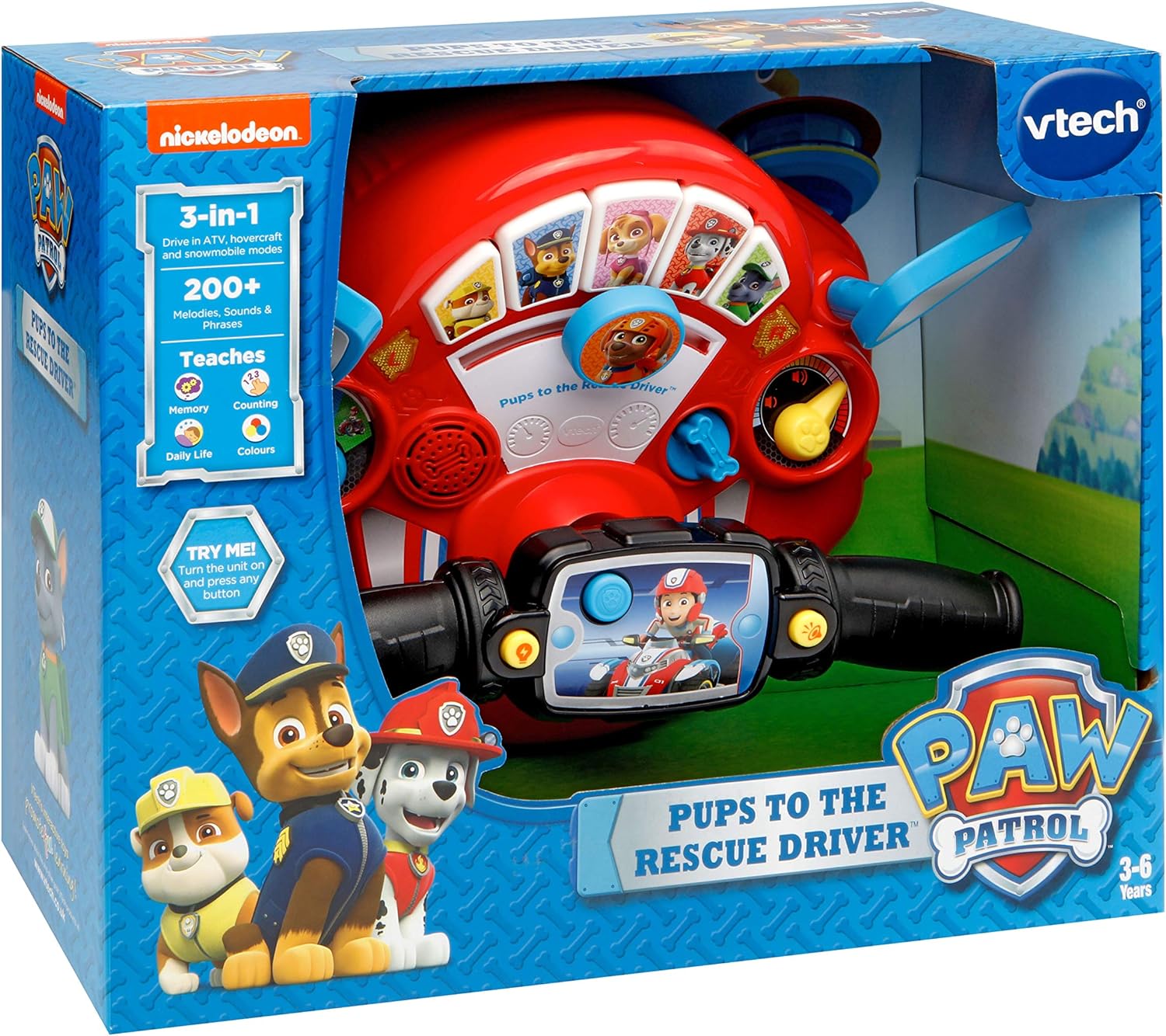 Go For A Drive On Ryder’S Atv With The Paw Patrol Pups To The Rescue Driver By Vtech. Just Like Ryder’S Atv, This Interactive Driver Also Transforms Into A Snowmobile And A Hovercraft For Exciting Role-Play. Turn The Handlebars To Steer The Vehicle To Save Mr. Porter’S Van And More. Press The Pup Buttons To Hear Ryder Introduce All Your Favorite Pups And Tell You All About Them. Go On Exciting Rescue Missions And Use The Turn Signals, Check The Rearview Mirror And Honk The Horn To Learn Numbers, Road Safety And More. No Job Is Too Big, No Pup Is Too Small.