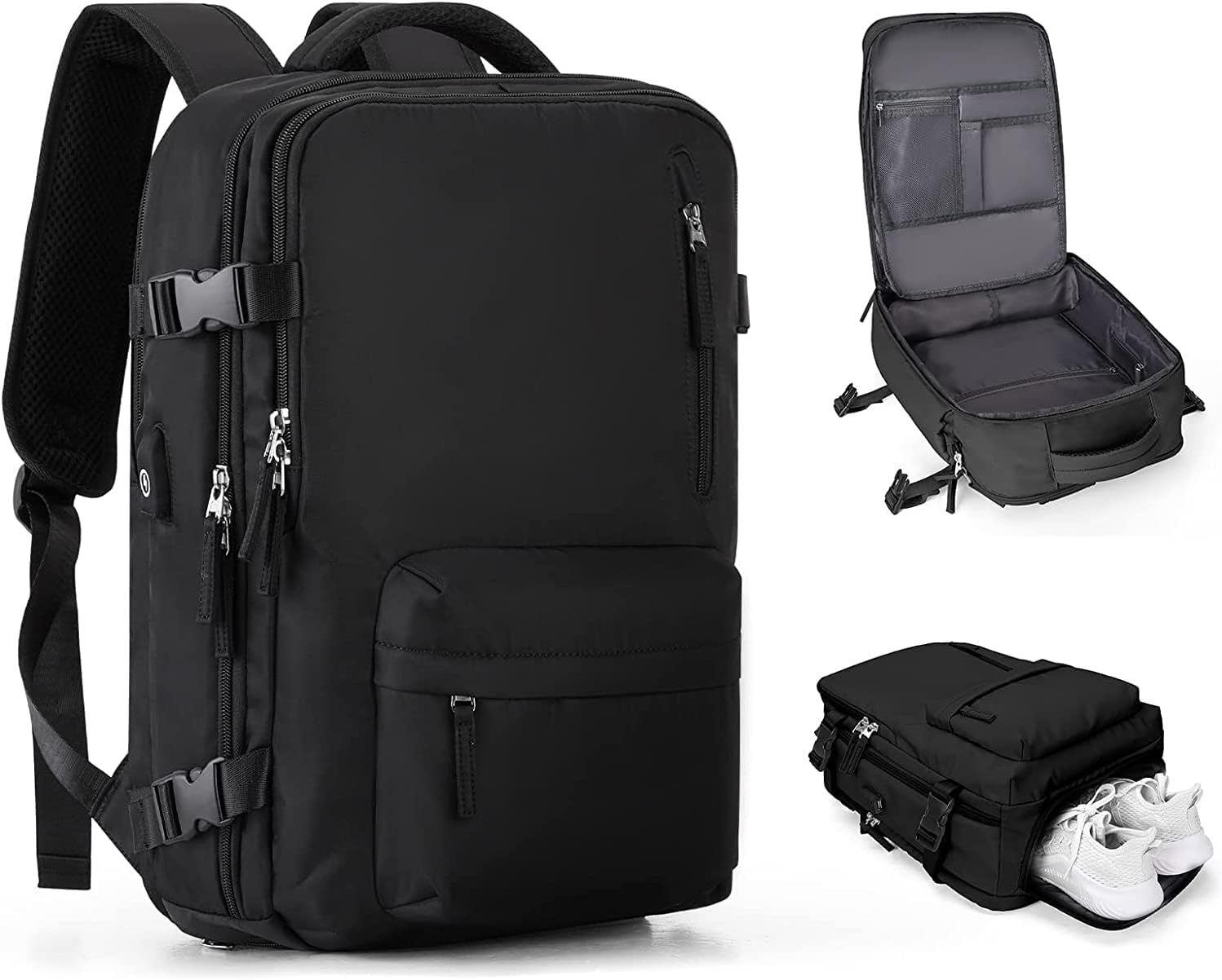 Travel Backpack for Airline Approved, Black Carry on Backpack, Waterproof Outdoor Sports Rucksack Casual Daypack Fit 15.6 Inch Laptop with USB Charging Port Shoes Compartment