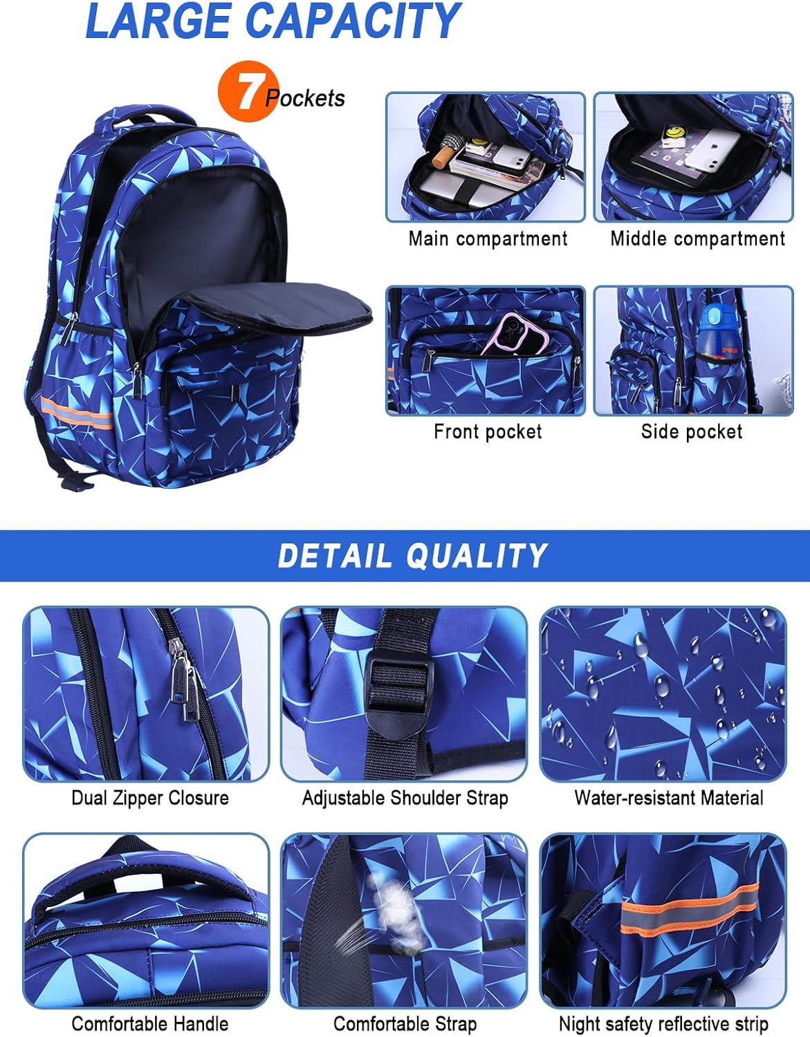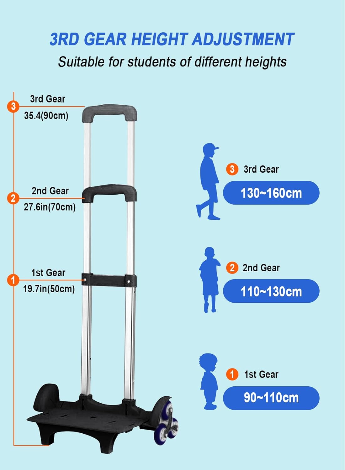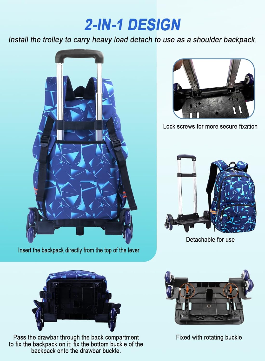 • Detachable 6-Wheel Trolley: This boys school bag after correct assembly, the backpack can stay on the trolley stably without rollover, wear-resistant rubber wheels, reinforced aluminum alloy double handle, telescopic design can save space. you could use the backpack with the trolley or trolley can be separated use if desired