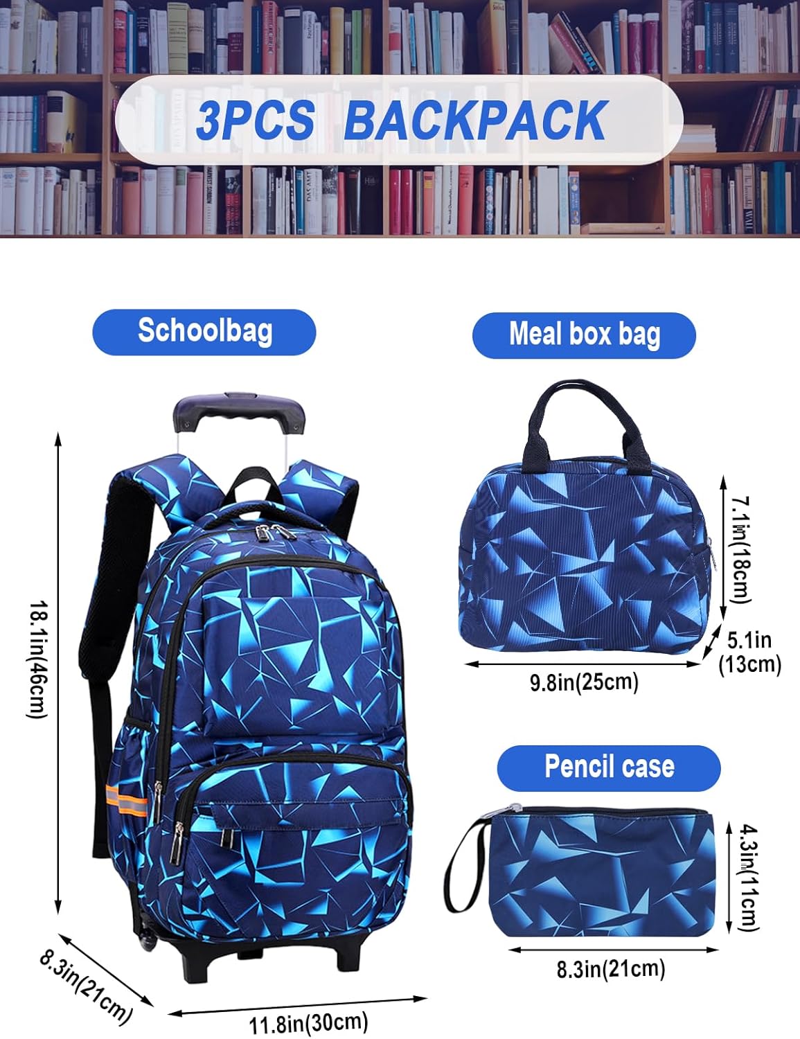 • Boys Rolling Backpack Size: 18.1"x 11.8"x 8.3"(L*W*H); about weight: 2kg; the rolling backpack with durable rubber solid 6 wheels design, sliding fast, not stuck, wear-resistant, the wheels are perfect for going up steps and curbs
