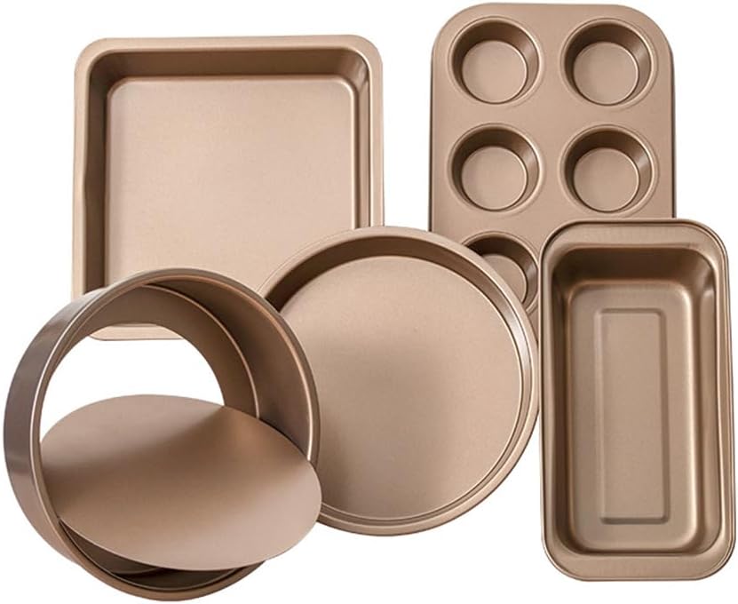Bakeware Set: The 5-piece set includes a round cake pan, a square cake pan, a loaf pan, a cup muffin pan, and a deep roast pan. All pieces of our baking set were designed to fit neatly into one another, saving you valuable space in your kitchen cabinets.