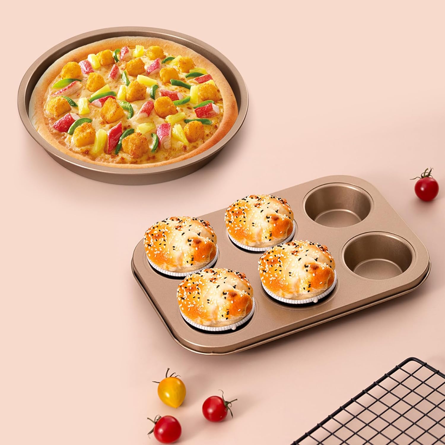 Multi-function: This kitchen bakeware set can make brownies cupcakes, muffins, bread, cakes, apple pie, tiramisu, cookies, pizza, lasagna, omelet, meatloaf, baklava, pot roast, turkey roasting, and much more. It's a versatile bake pan set for all people.