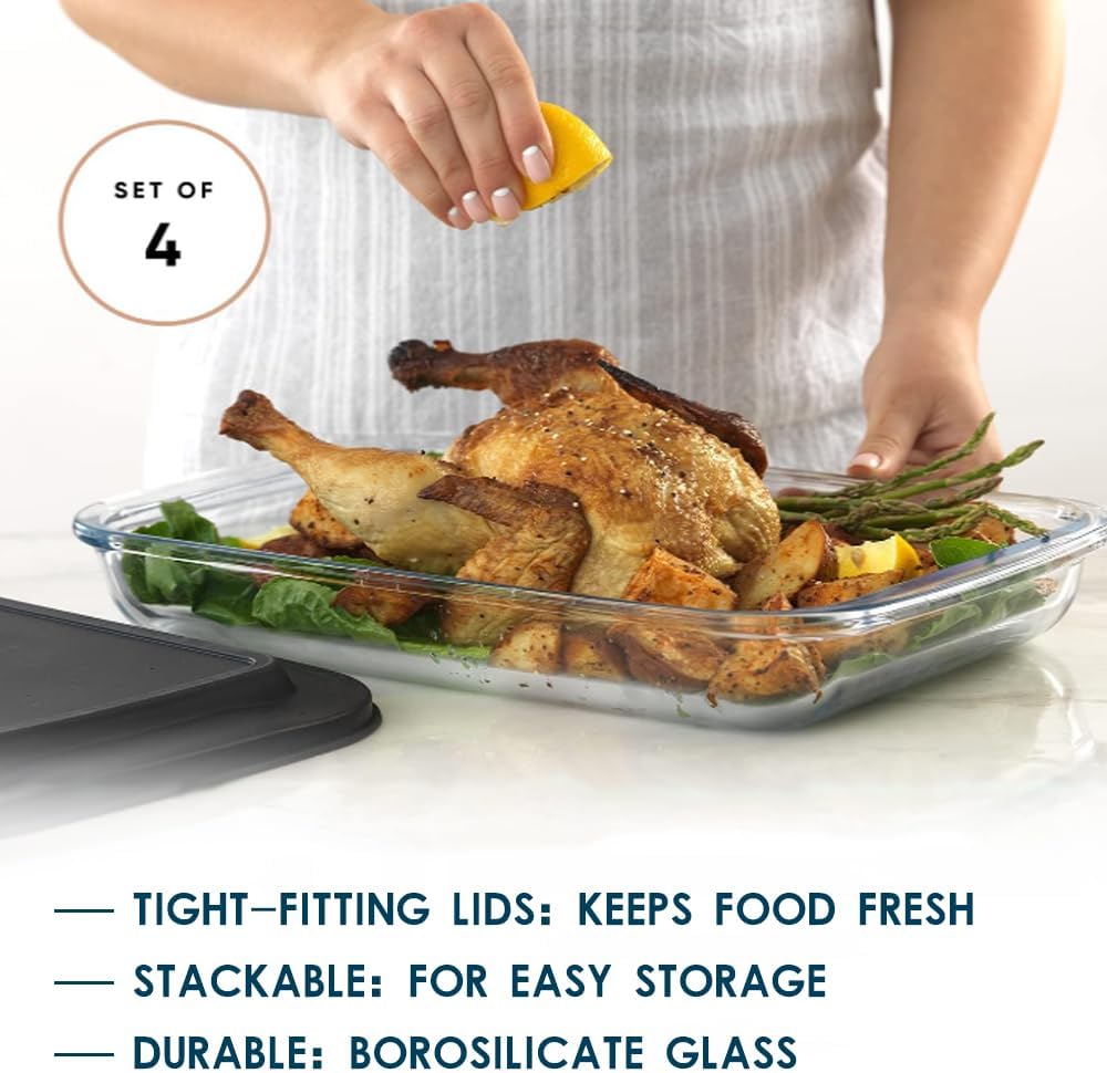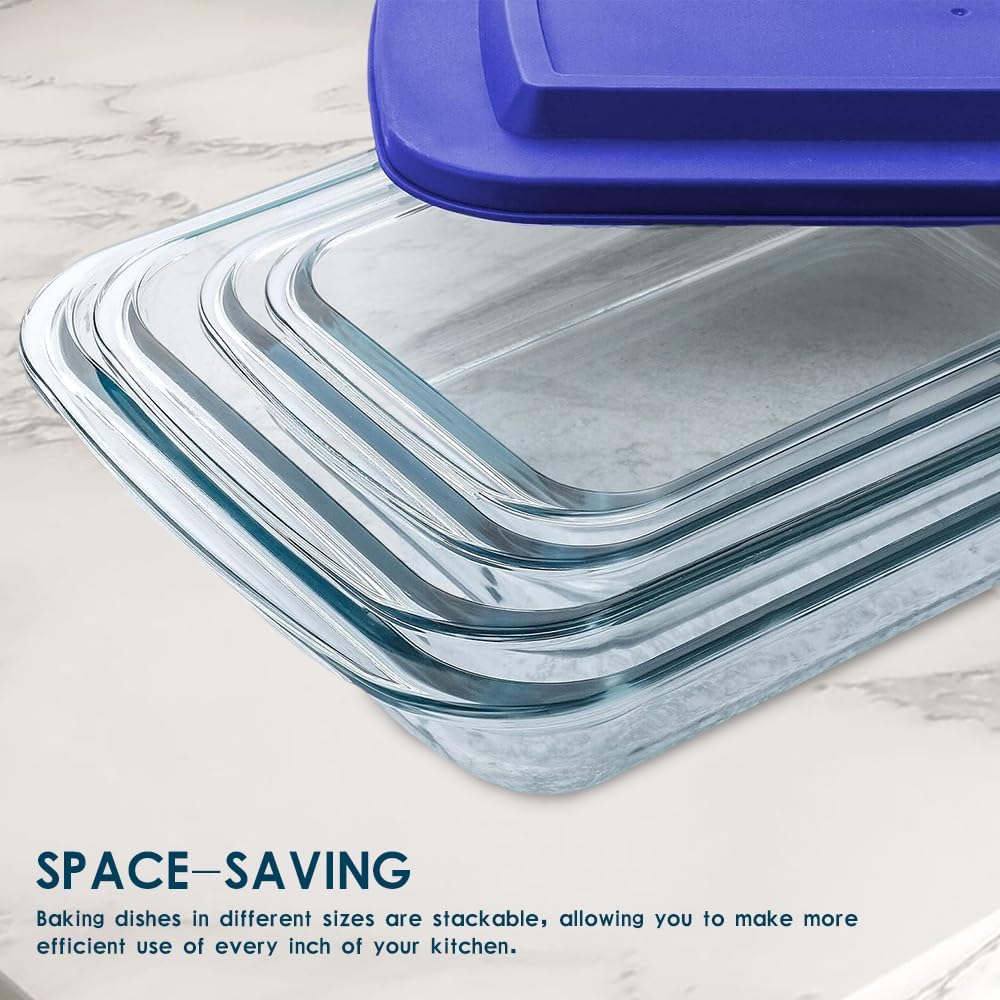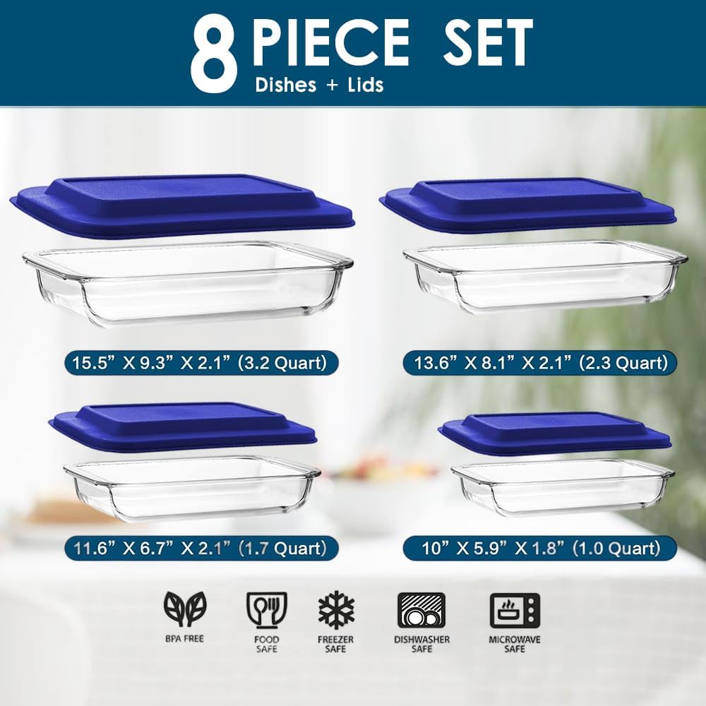 Deep Glass Baking Dish Set with Plastic lids, 8-Piece Rectangular Glass Bakeware Set with Lids, Baking Pans for Lasagna, Leftovers, Cooking, Kitchen, Freezer-to-Oven and Dishwasher