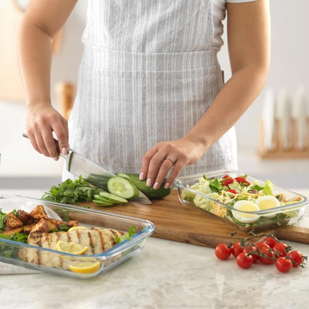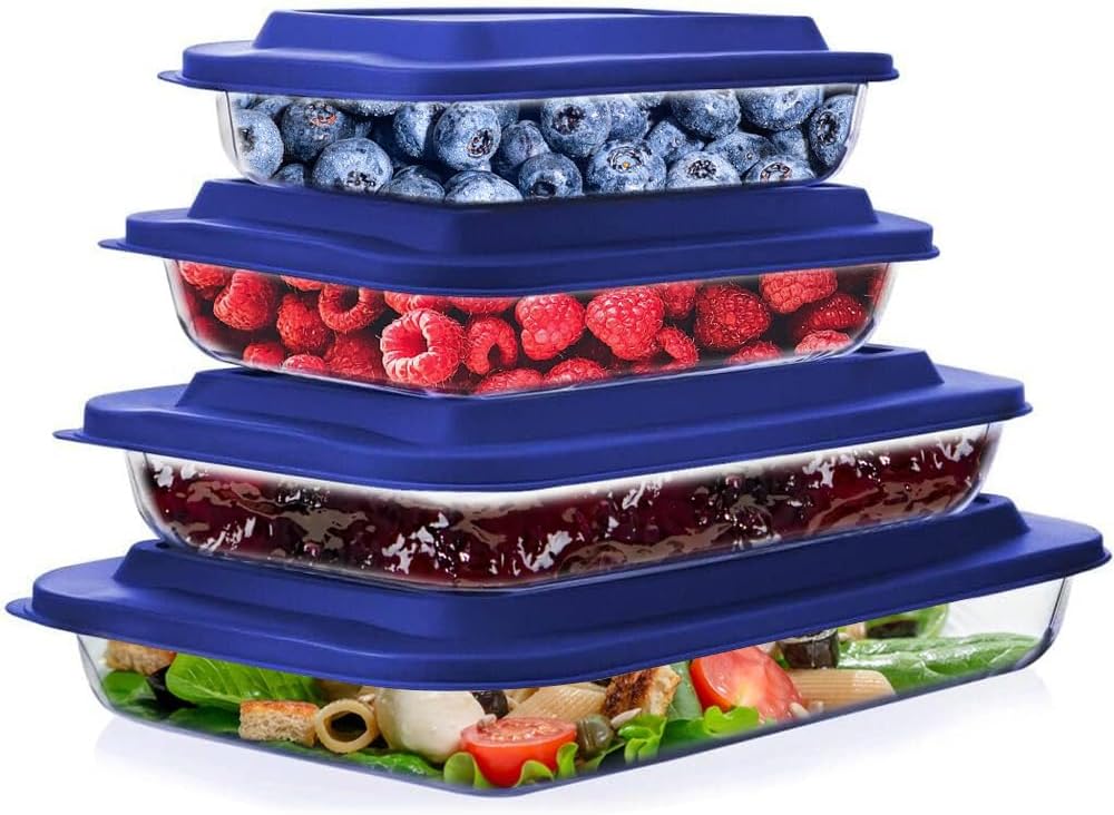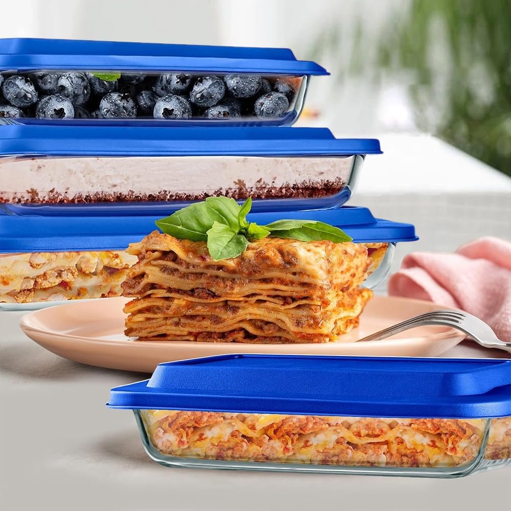 TIGHT FITTING LIDS: 8-piece baking dishes set includes 4 baking dishes and 4 blue plastic tight fitting lids, which are designed to keep your food fresher longer. Made with a special non-slip design, you can stack these 4 containers with lids on top of each other in your fridge or freezer for space saving storage. Also they are sloshproof to prevent spilling while storing or on the go. The ideal set for baking, serving and storing food.