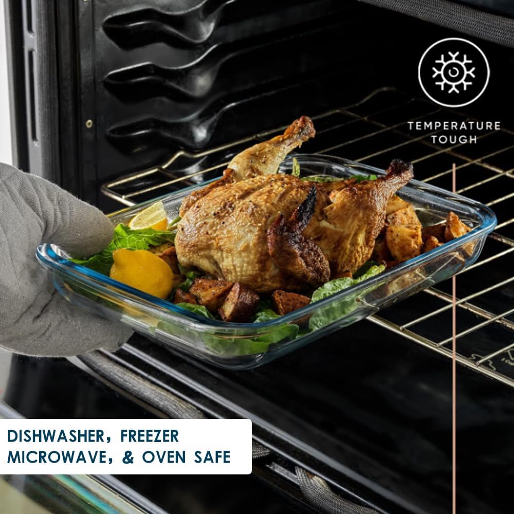 HIGH QUALITY LARGE FOOD GRADE BAKING PAN SET: Our baking dishes are made of borosilicate glass, can be used in microwave, oven, freezer and dishwasher, goes straight from the refrigerator to the microwave or oven to the table without the risk of cracking or shattering.