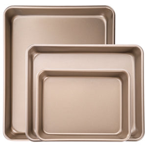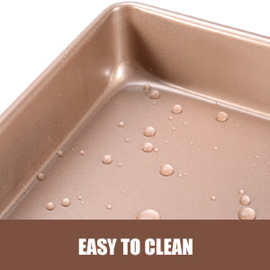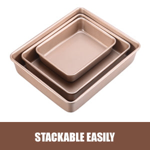 🍰EXCLUSIVE VALUE BAKING PAN SET: The baking pan sets include 3 piece deep baking pans,gold color,with a 7x9 small rectangle cake pan,a 9x11 medium baking sheet and a 10.5x12.8 large baking pan,provide the perfect option for your daily oven pan needs.