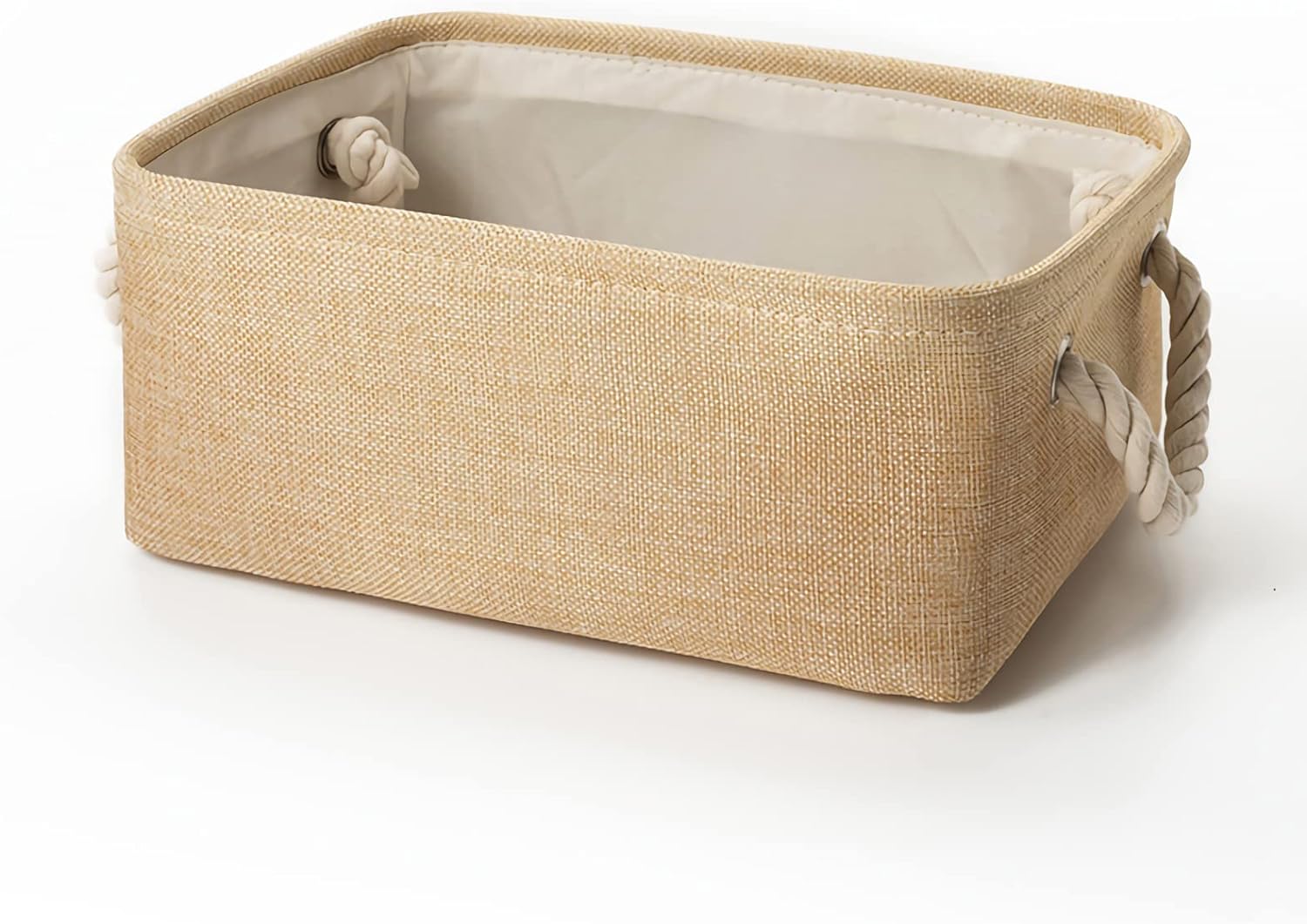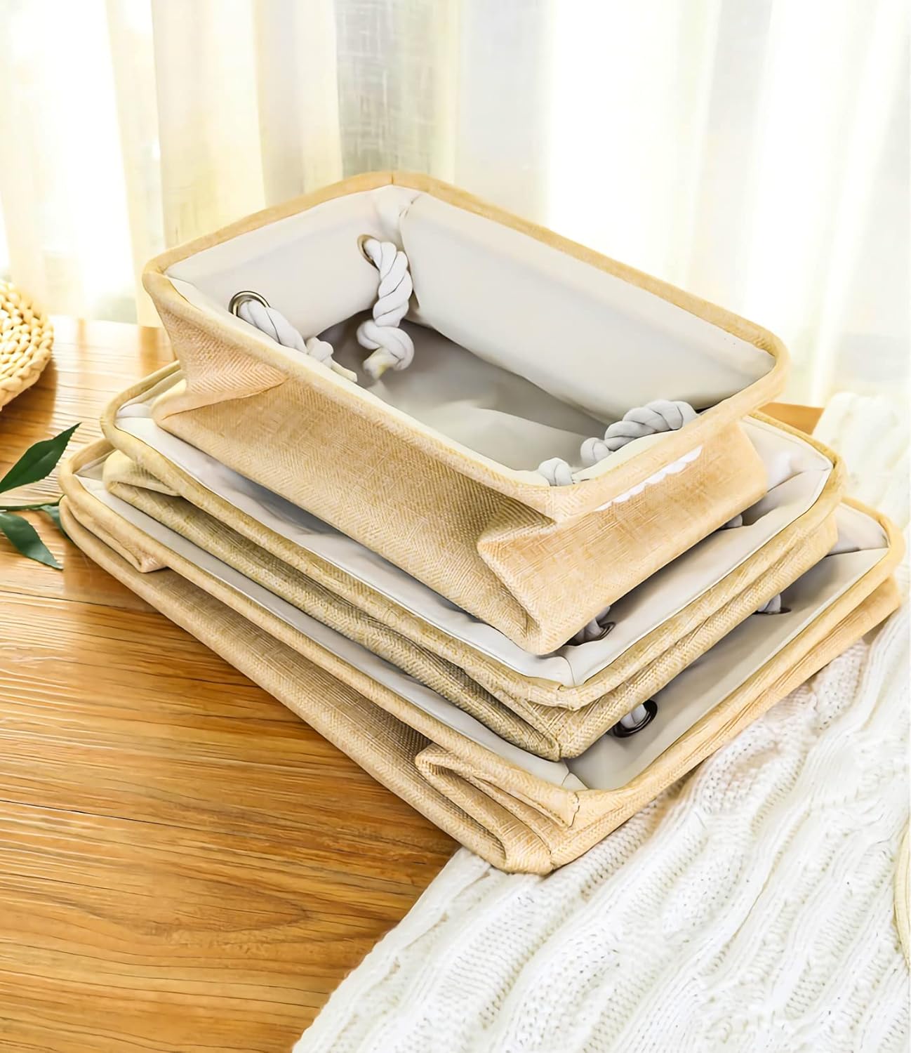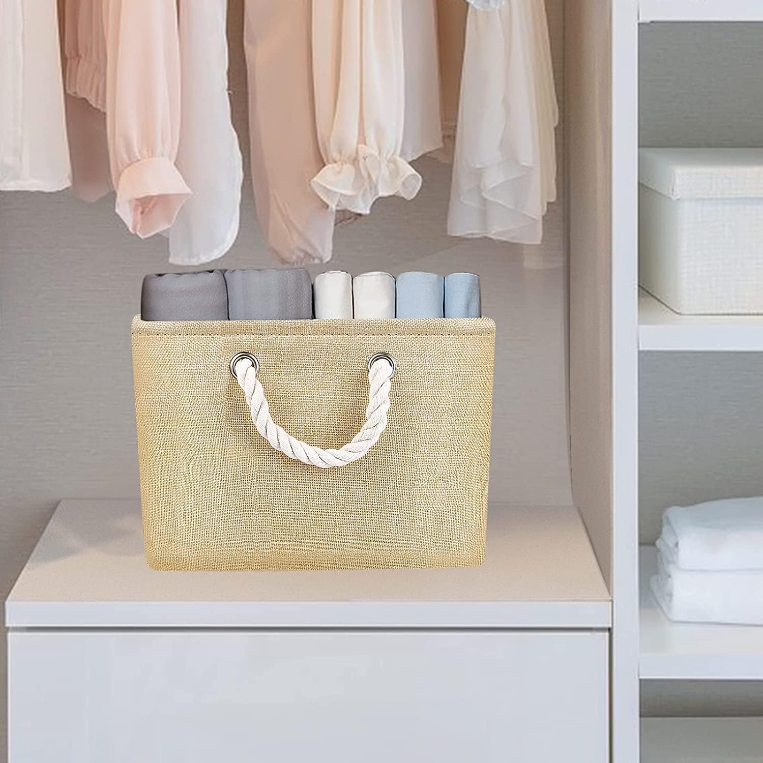 STURDY ROPE HANDLE: The baskets for organizing are equipped with rope handles on both sides for easy access and carrying. The rope handle makes it easy to slide it in and out of the shelf or closet. They are fixed on the basket by metal grommets, which are firm and durable, and do not hold hands.