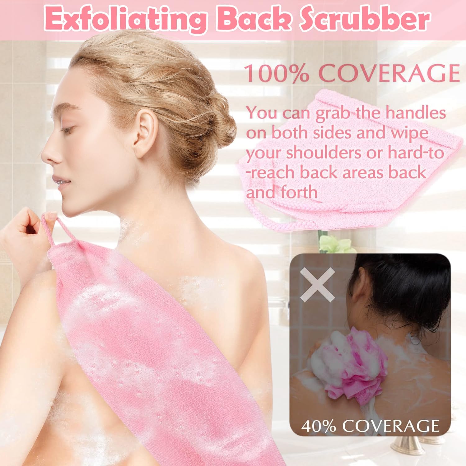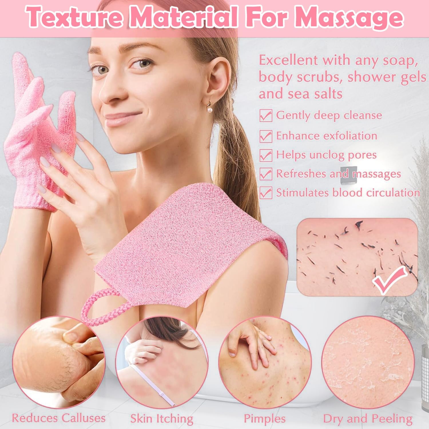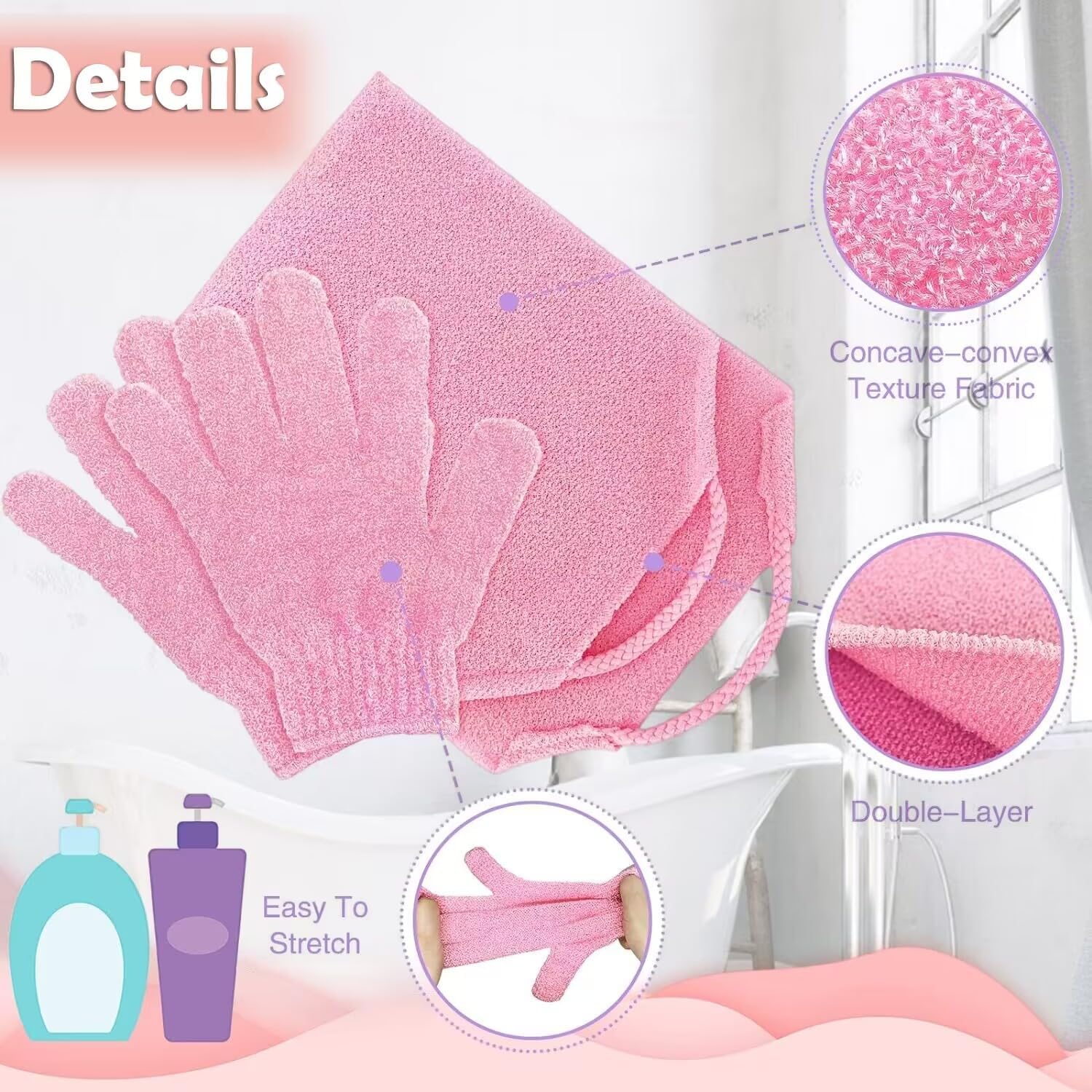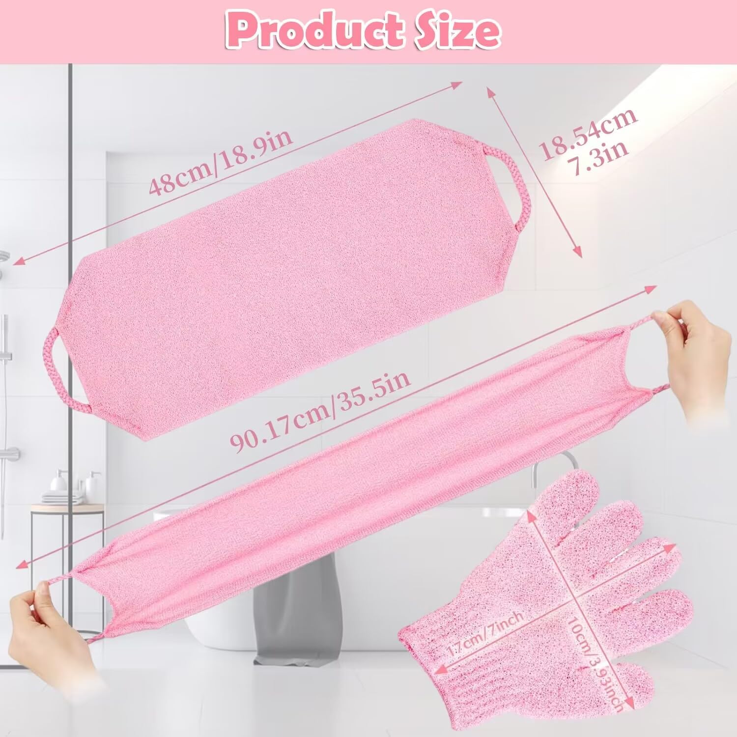 🛀 WHAT YOU WILL GET: Package comes with a bath body scrubber and a pair of bath gloves in pink color, perfect bath accessories for women and teenager girls.