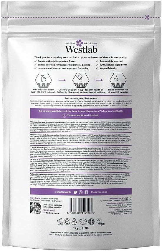 GUARANTEED SAFETY, PURITY AND MINERAL CONTENT: Westlab Magnesium Flakes are superior quality, which makes them safe for Pregnancy, children, athletes of a competitive standard or for therapeutic treatment. Westlab salts are independently tested in the UK to confirm mineral content, safety and purity. This includes clinical testing and German BVL standards for heavy metal safety, to meet Westlab's strict quality credentials as the UK's most trusted salts.