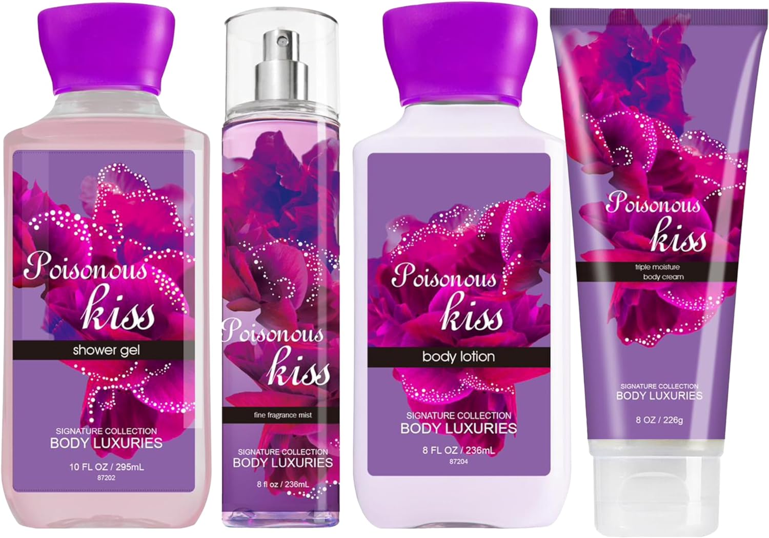 Body Luxuries (Poisonous Kiss) 5 PCs Gift Set - Shower Gel 259ML + Fragrance Mist 236ML + Body Lotion 236ML + Body Cream 236ML | Bath & Body Gift Set