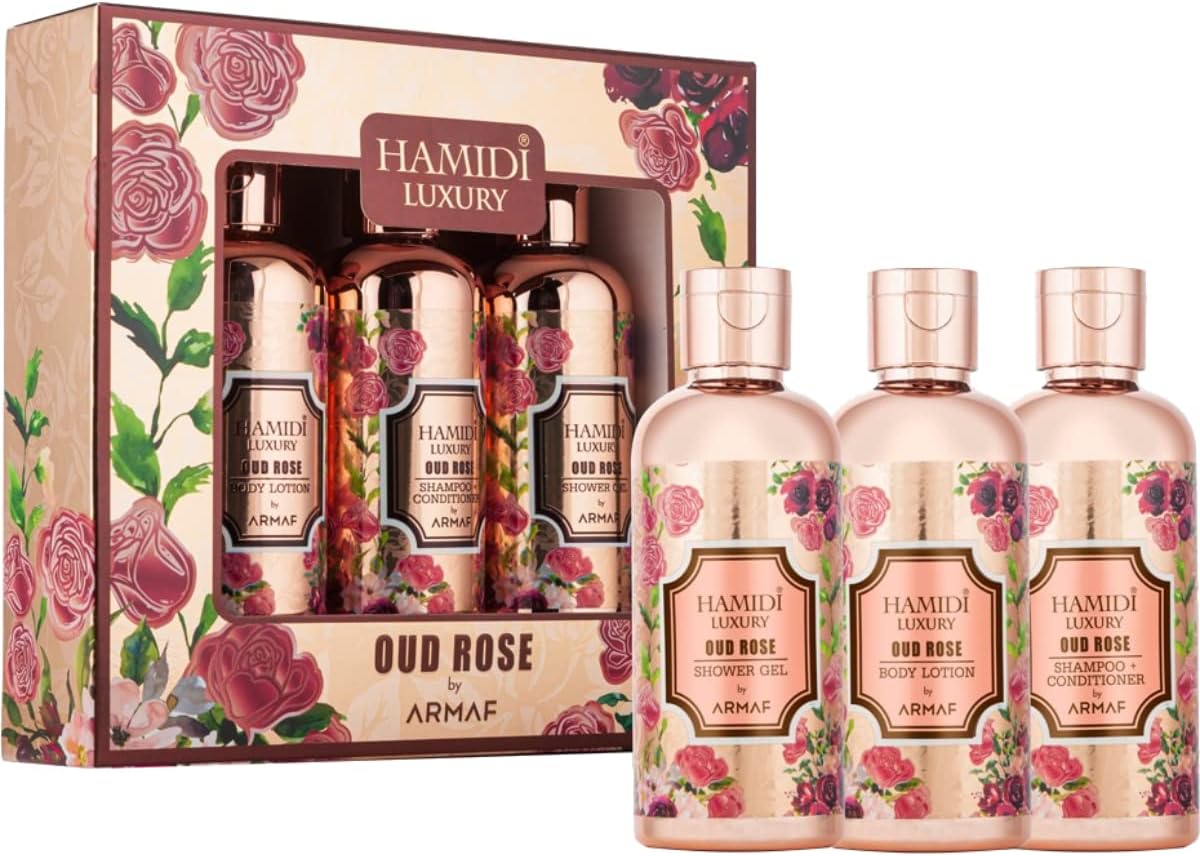 Hamidi Luxury Oud Rose by Armaf, 3 Pieces Gift Set For Men & Women, Shower Gel 95ml, Body Lotion 95ml, Shampoo & Conditioner 2 in 1 95ml | Alcohol Free | Hair & Skin Care Product | Daily Care