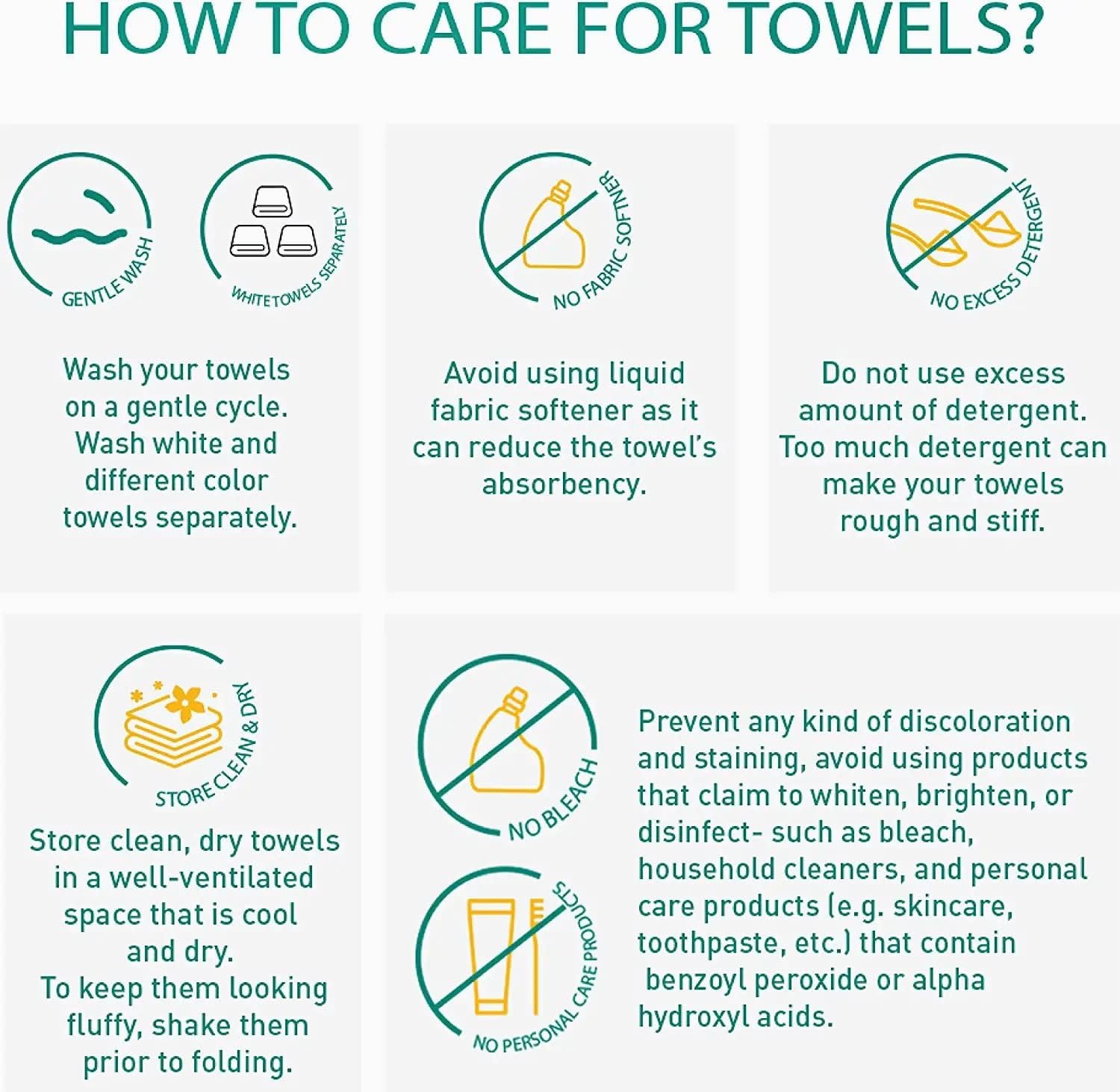 ✔Towels contain long loop-pile height which makes them extra fluffy and extremely absorbent. For best use, wash separately on first use. You may see some lint and color on the first wash due to the towels cotaining 100% cotton but should diminish after each washing. This will not affect the look, feel, or performance of your towel set.