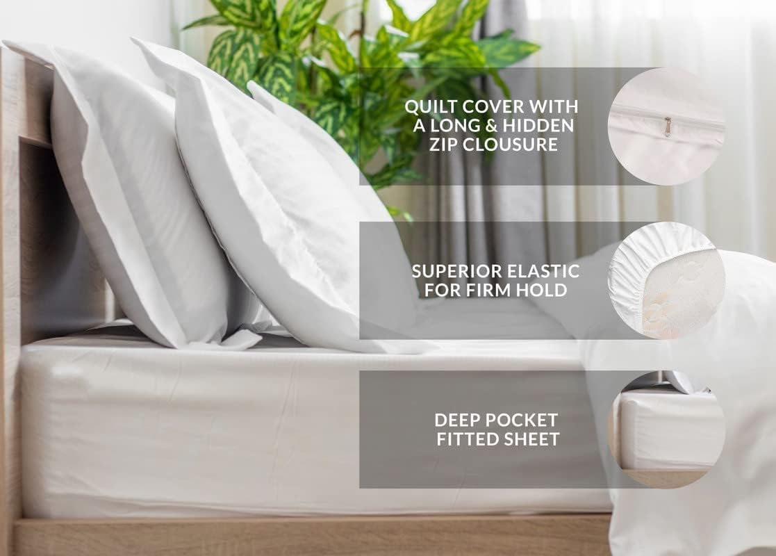 PERFECT FIT : High quality elastic at the 4 corners of the bedsheet provides deep pockets that fit mattresses of up to 40cm thickness. The perfectly fitted sheet doesn’t move while you sleep. The Duvet cover has a hidden zip closure and fits a standard king size duvet perfectly.