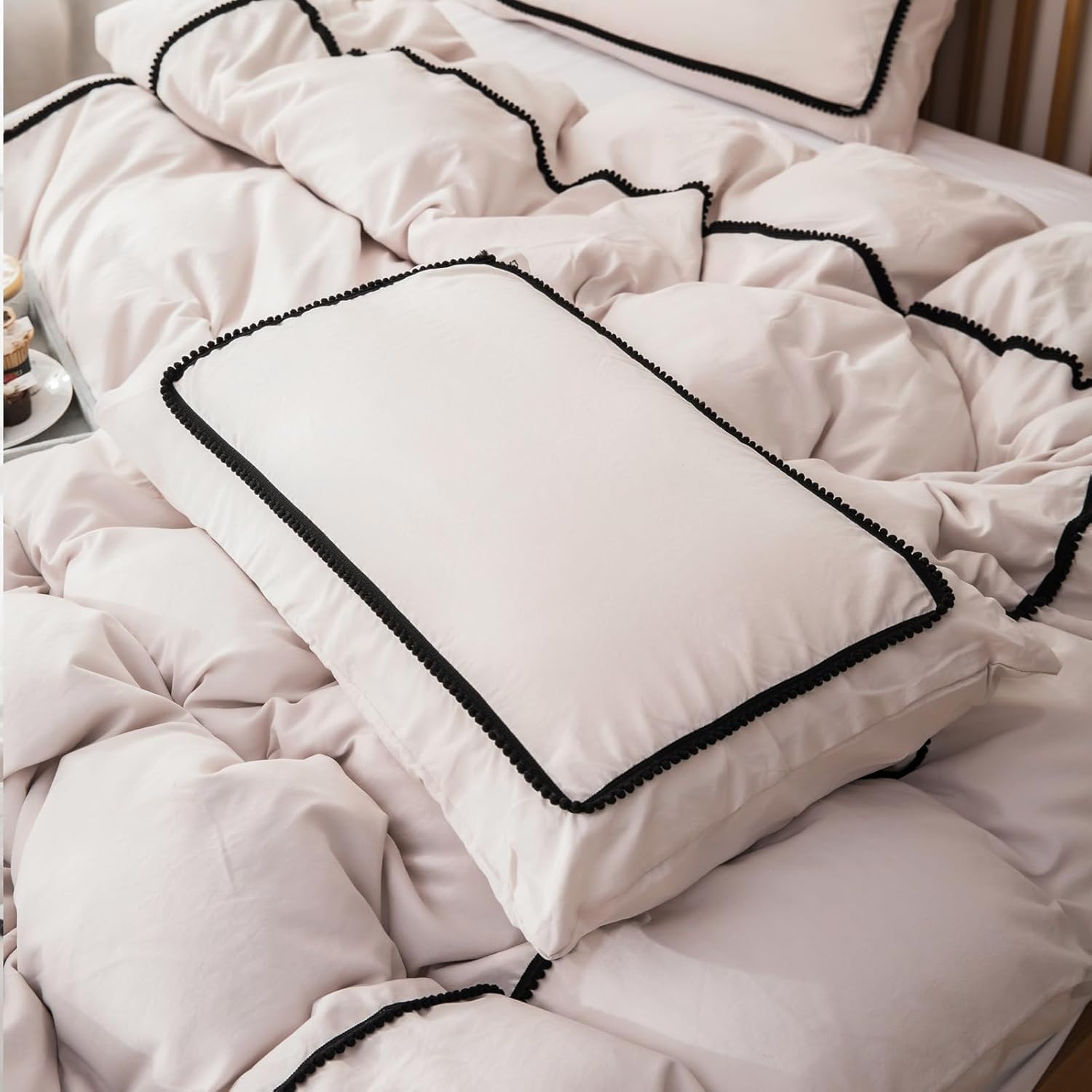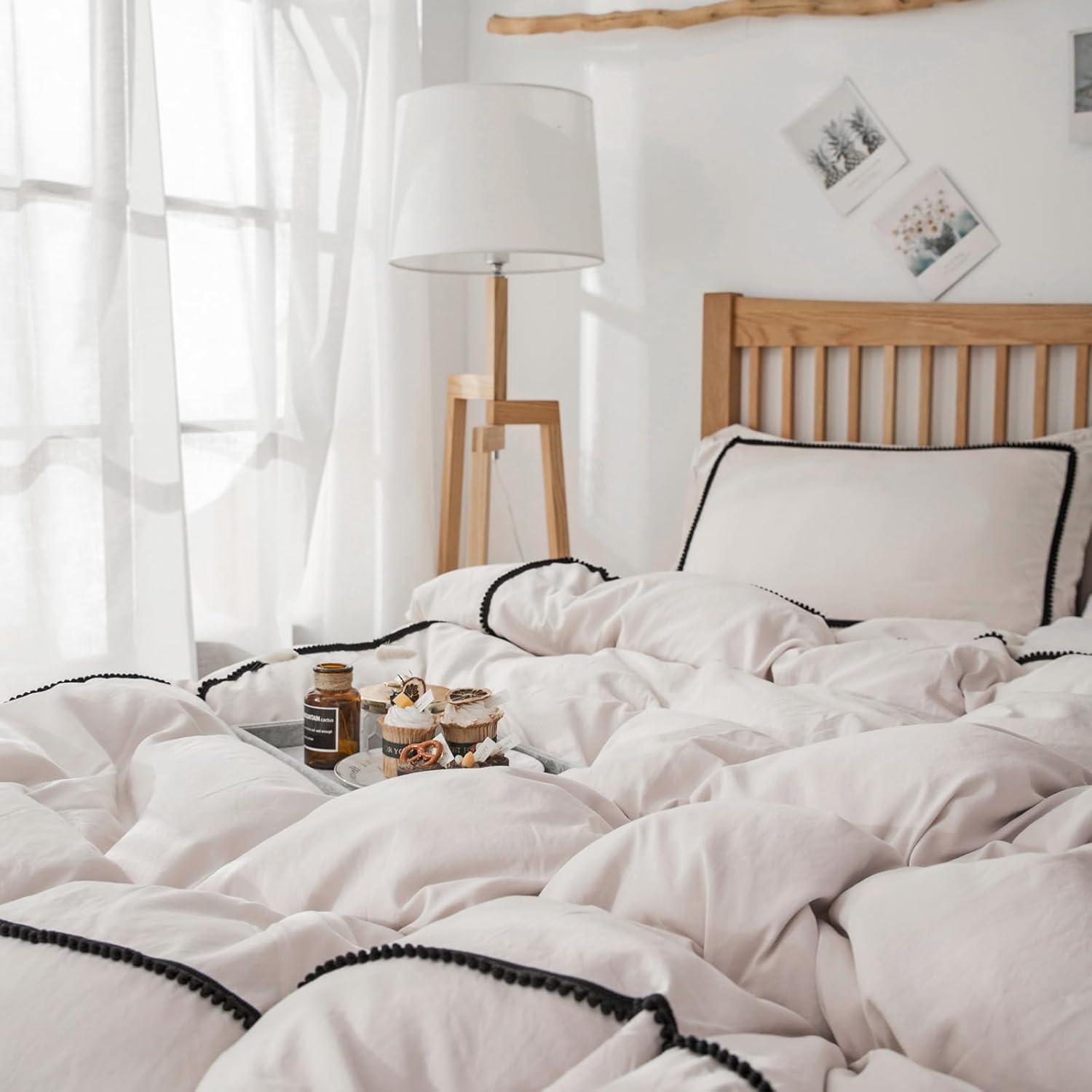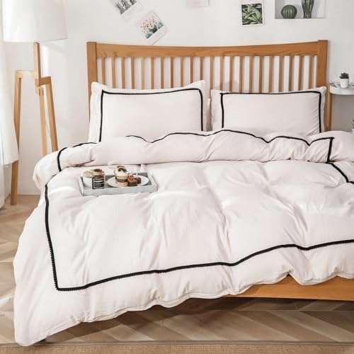 Herside Beige Duvet Cover 220x240 Boho Bed Cover Bedding Set Chic Mini Black Pompoms Cute Bedding Cover Aesthetic Room Decor 3 Pcs Soft and Cozy Farmhouse Quilt Cover(Beige Grey&Black, 220 * 240)