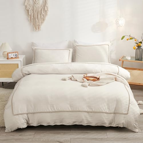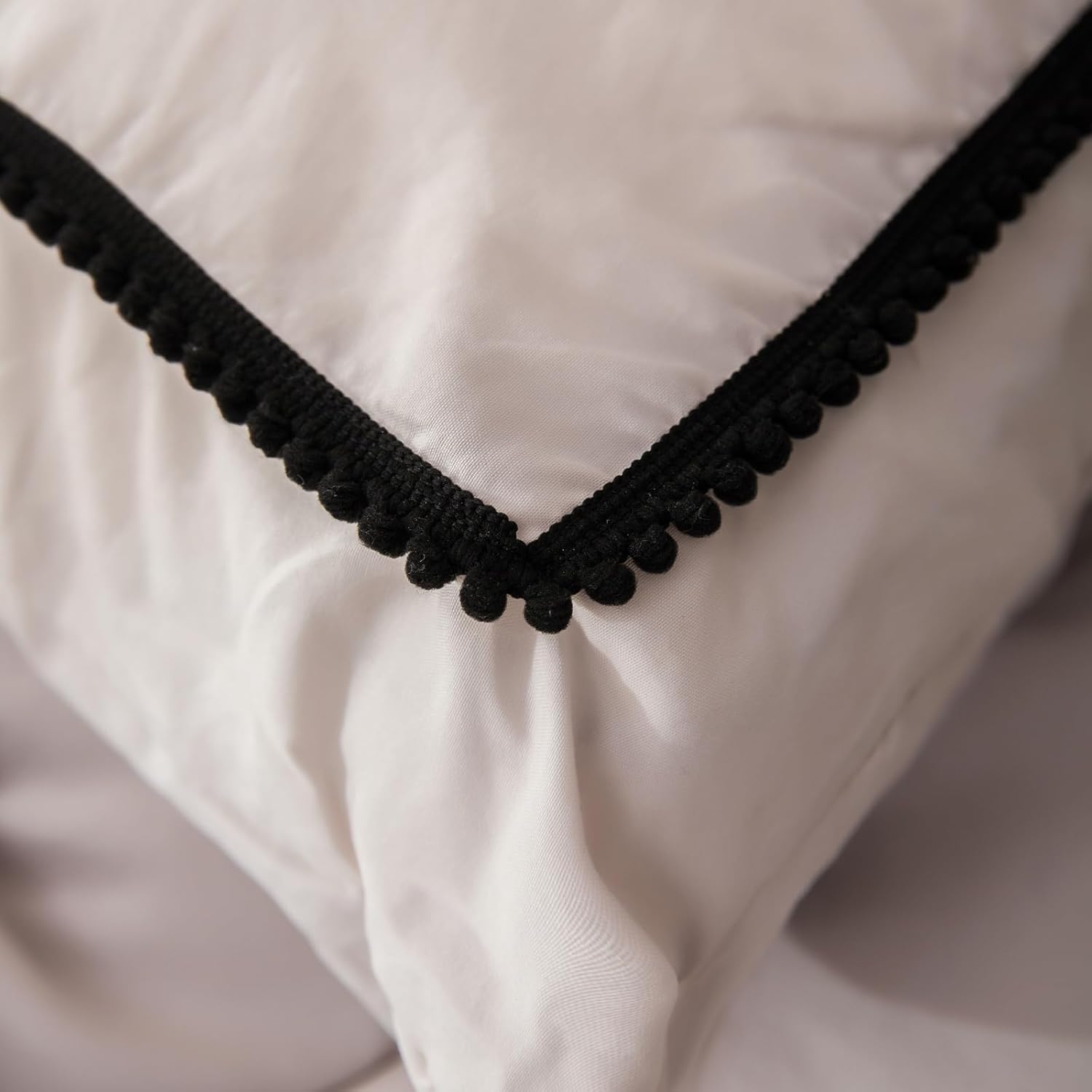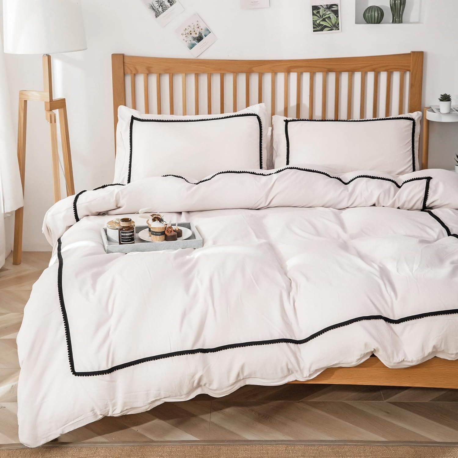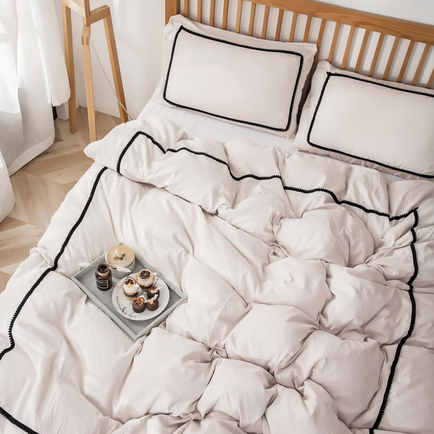 Herside Beige Duvet Cover 220x240 Boho Bed Cover Bedding Set Chic Mini Black Pompoms Cute Bedding Cover Aesthetic Room Decor 3 Pcs Soft and Cozy Farmhouse Quilt Cover(Beige Grey&Black, 220 * 240)